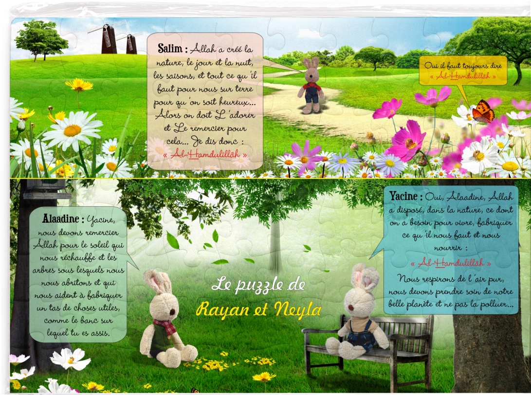 Dans ce puzzle personnalisable, l'enfant va apprendre à remercier Allah pour Ses bienfaits, pour la nature et tout ce qu'il y a sur Terre comme bonnes choses... L'enfant va apprendre également qu'il faut dire souvent "Al-Hamdulillâh"...