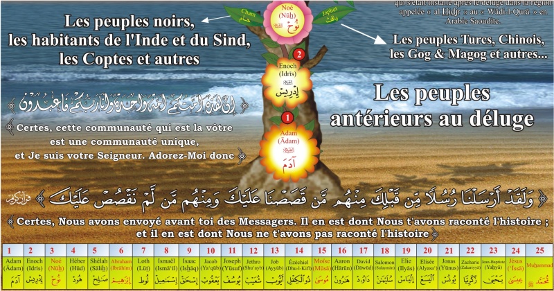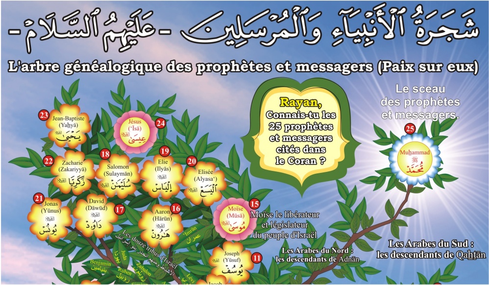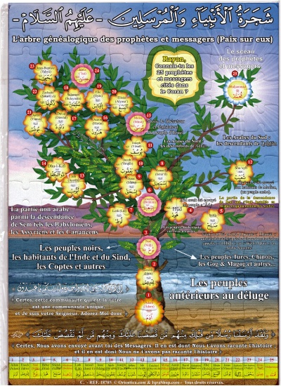 Puzzle personnalisable de l'arbre généalogique des prophètes en couleur regroupant tous les prophètes connus dans la tradition musulmane. On y distingue les 5 grands prophètes en couleur rose (Ouloul-'Azmi minal-Roussoul) et le sceau des prophètes (le dernier des proprohètes et messagers) Muhammad (Paix et bénédition d'Allah sur eux tous). L'ordre des prophètes est indiqué grâce à la numérotation.
