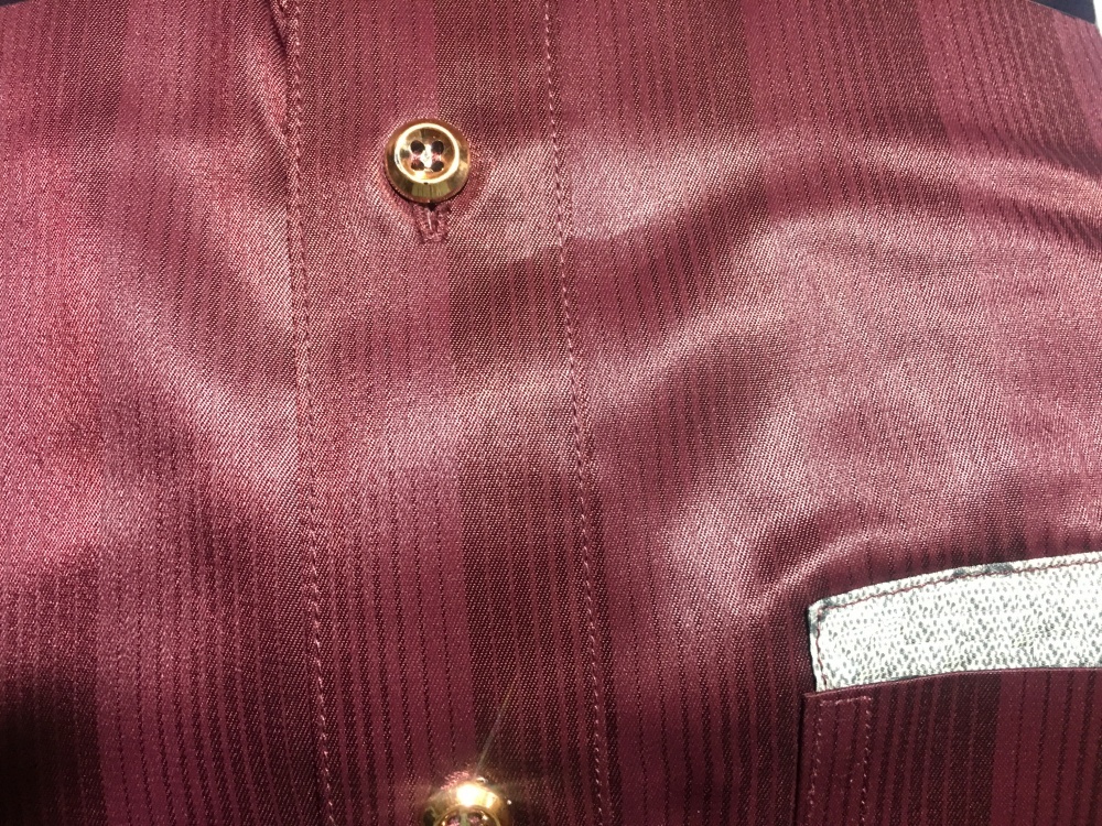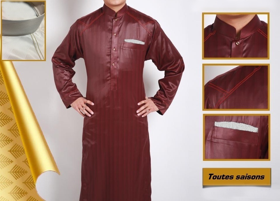 Qamis originale de couleur bordeaux (comme sur la photo) avec poche stylée avec tissu gris stylé. Tissu avec rayures discrètes. Boutons dorés...
