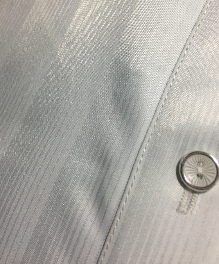 Qamis original de couleur gris clair avec poche stylée stylé. Tissu satiné avec rayures discrètes. Boutons blanc avec bordure argentée...