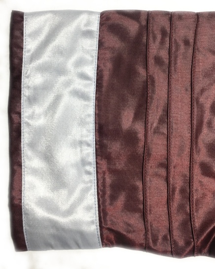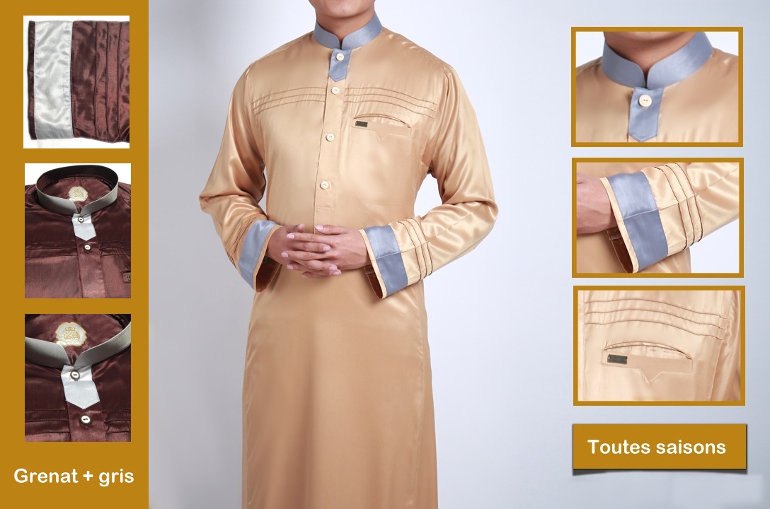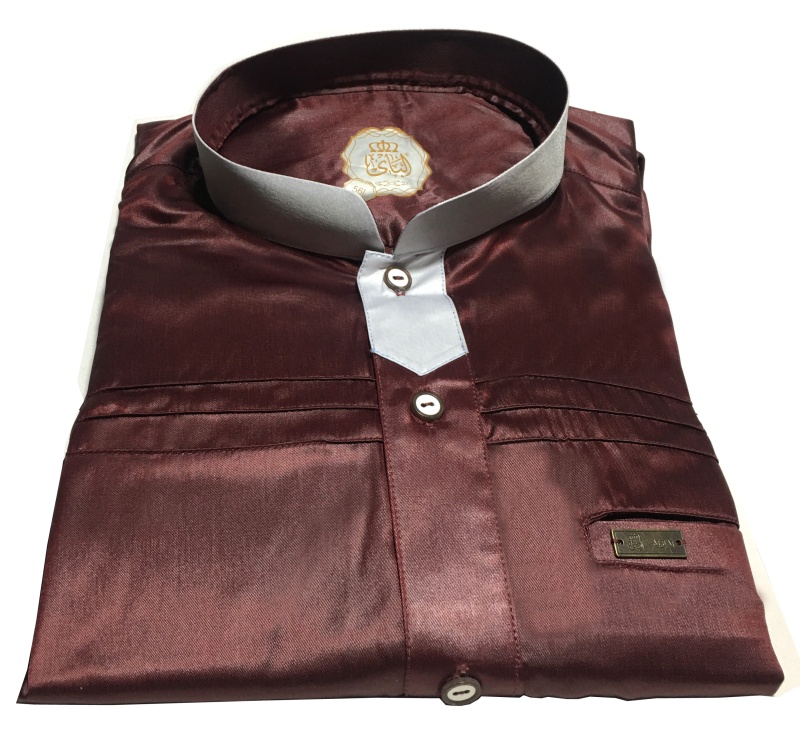 Qamis élégant de marque Albai de couleur grenat et gris argenté. Le col et les manches au niveau des poignets sont gris légèrement argentés.