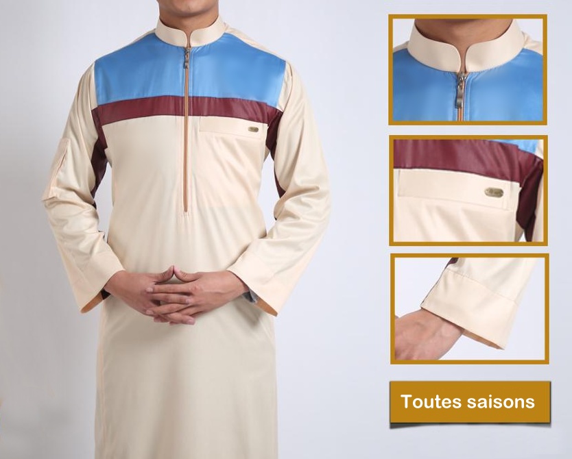 Qamis homme moderne haut de gamme de couleur beige, marron-bordeaux et bleue (tissu satiné) Vetement & Accessoire