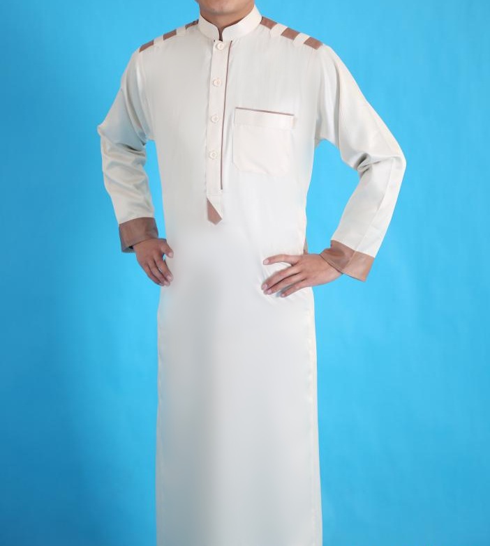 Qamis homme satine moderne de luxe - Couleur blanc casse et marron