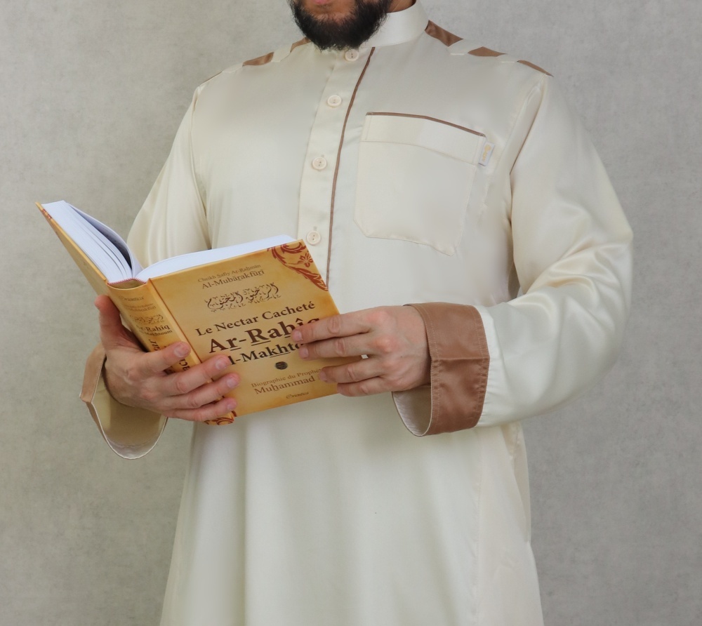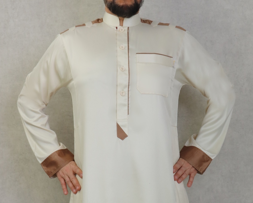 Qamis traditionnel élégant de qualité supérieure couleur blanc cassé et camel - REF. 32204 (49.00 €)