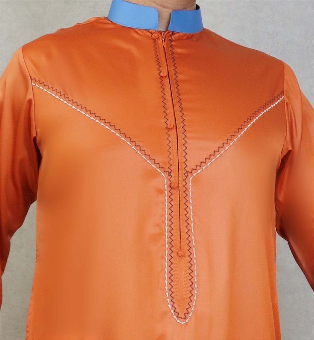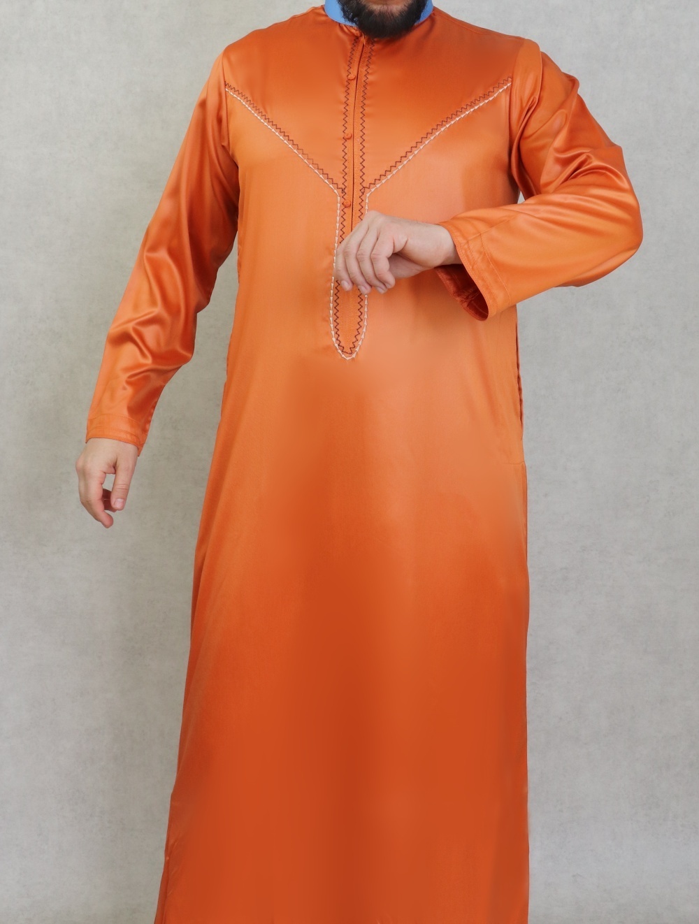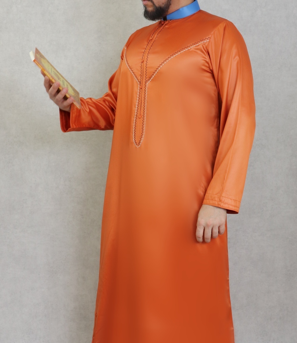 Qamis traditionnel élégant pour homme de qualité supérieure avec broderies et tissu satiné - Couleur orange - REF. 35340 (49.00 €)