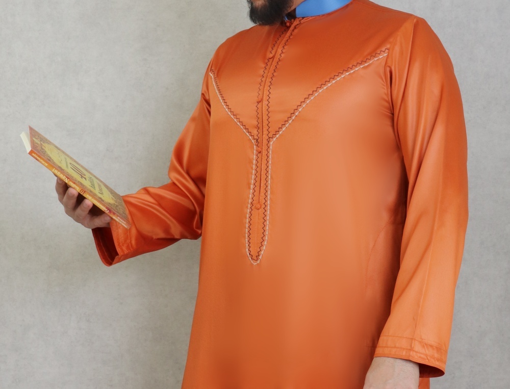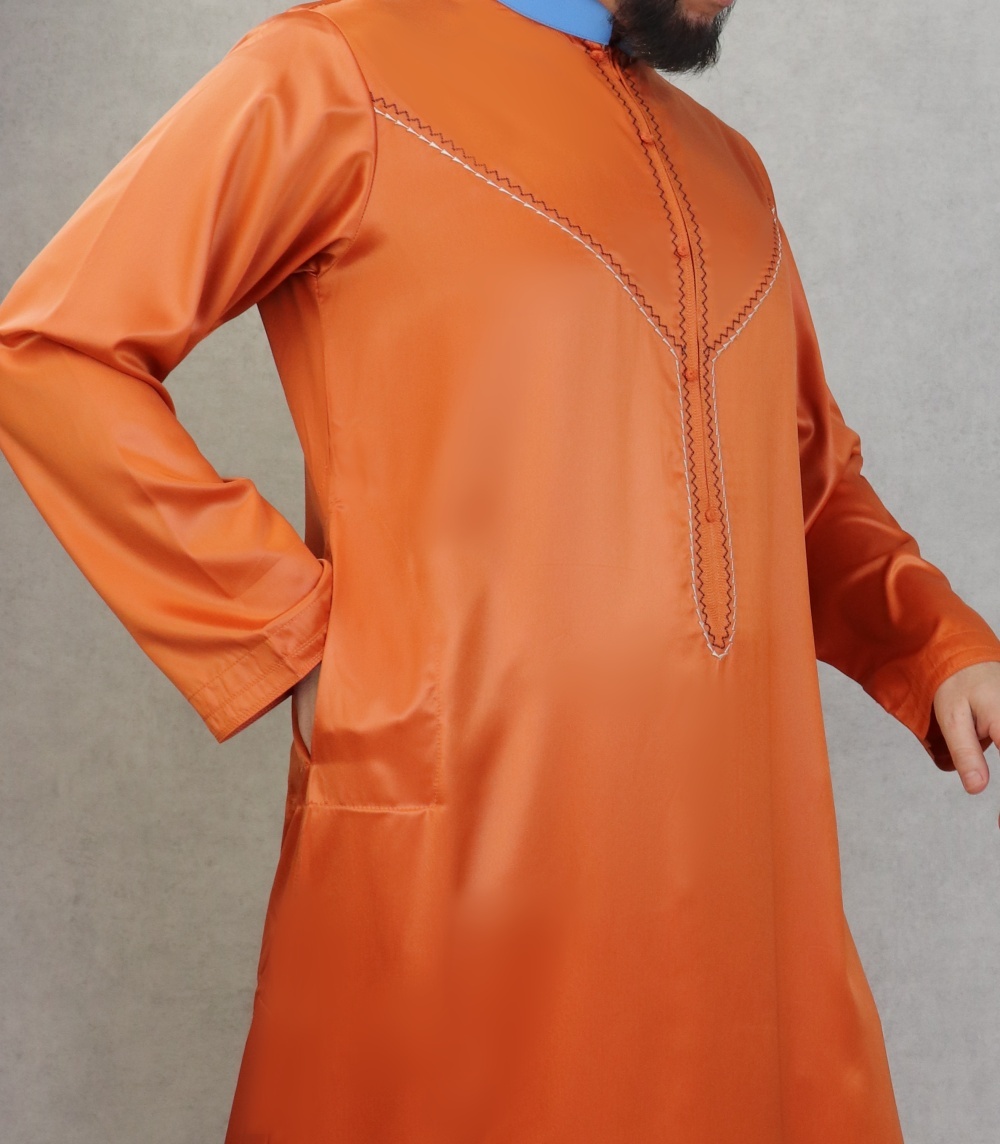 Qamis traditionnel elegant pour homme de qualite superieure avec broderies et tissu satine - Couleur orange
