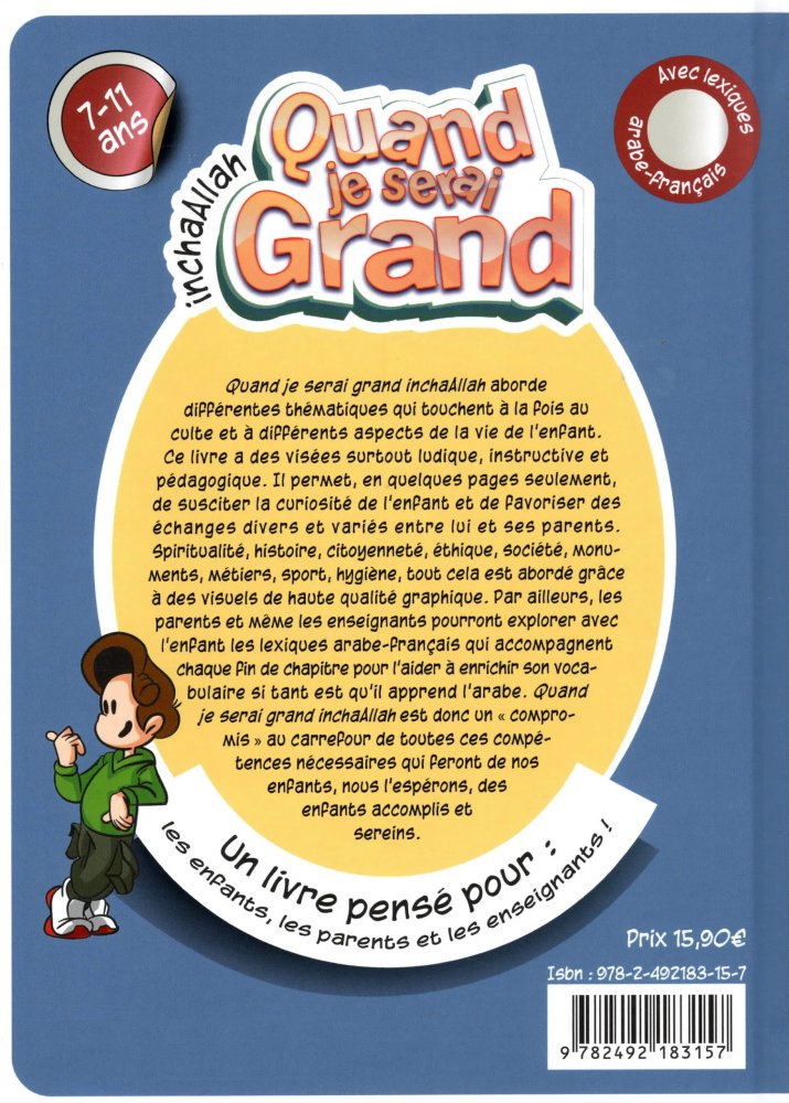 Quand je serai grand inchaAllah aborde différentes thématiques qui touchent à la fois au culte et à différents aspects de la vie de l’enfant. Ce livre a des visées à la fois ludique, instructive et pédagogique. Il permet, en quelques pages seulement, de susciter la curiosité de l’enfant et de favoriser des échanges divers et variés entre lui et ses parents. Spiritualité, histoire, citoyenneté, éthique, société, monuments, métiers, sport, hygiène, tout cela est abordé grâce à des visuels de haute qualité graphique.