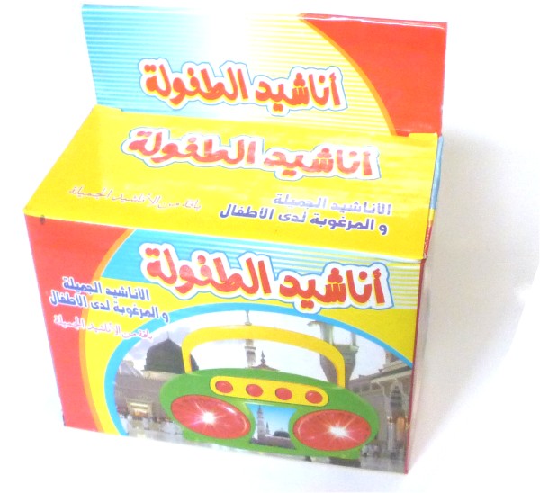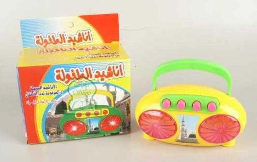 Petite radio contenant des chants musulmans pour enfants. Le premier bouton de gauche commande la marche ou l'arrêt et les 3 autres font entendre chacun un chant différent. Sons et lumières.