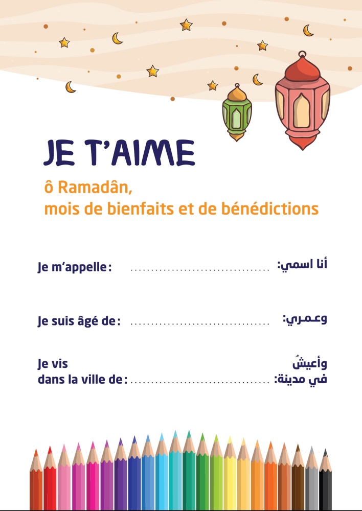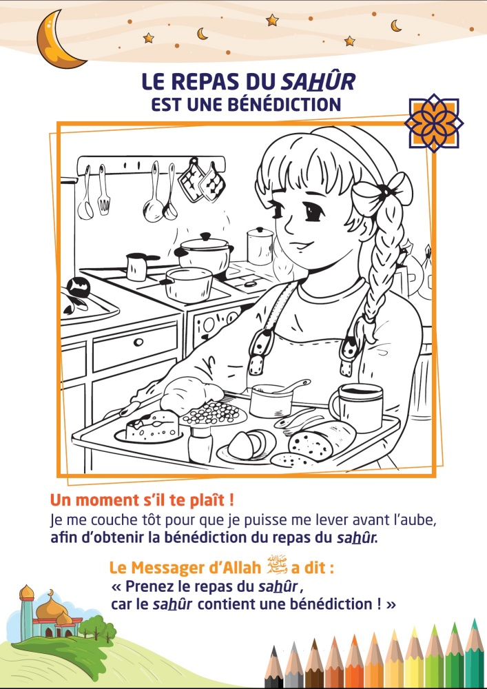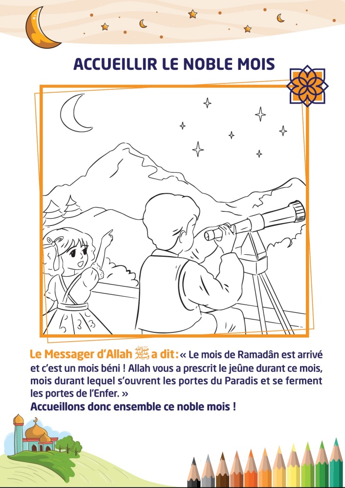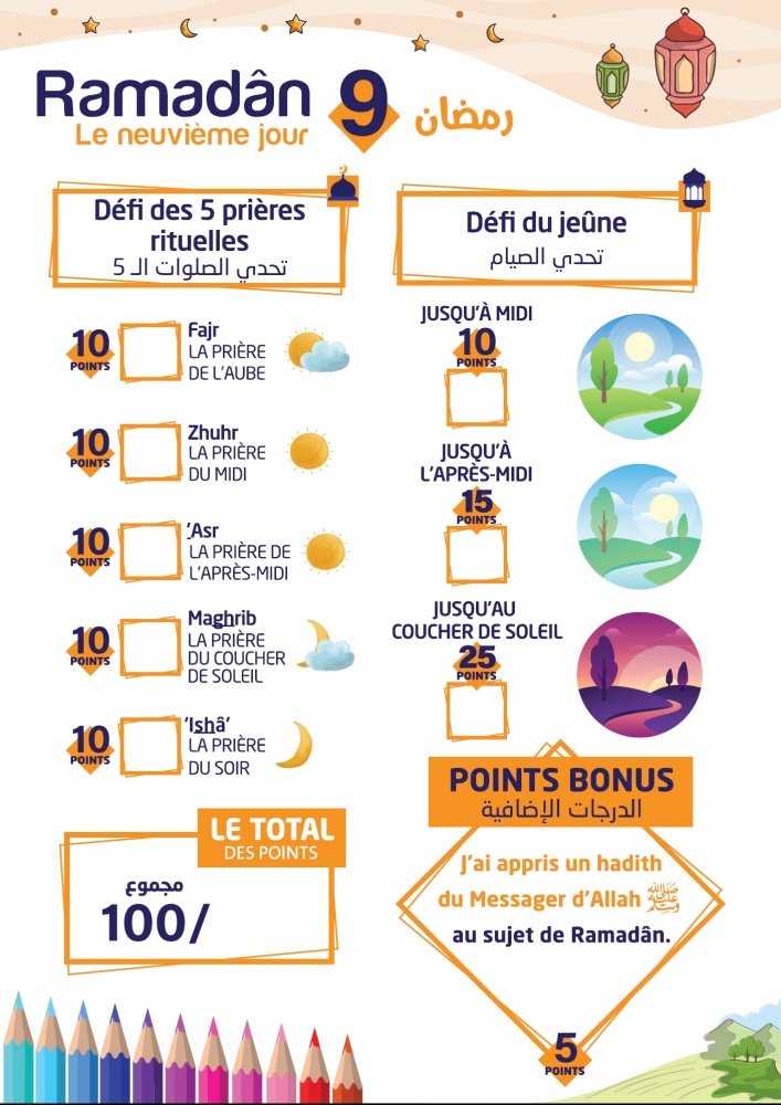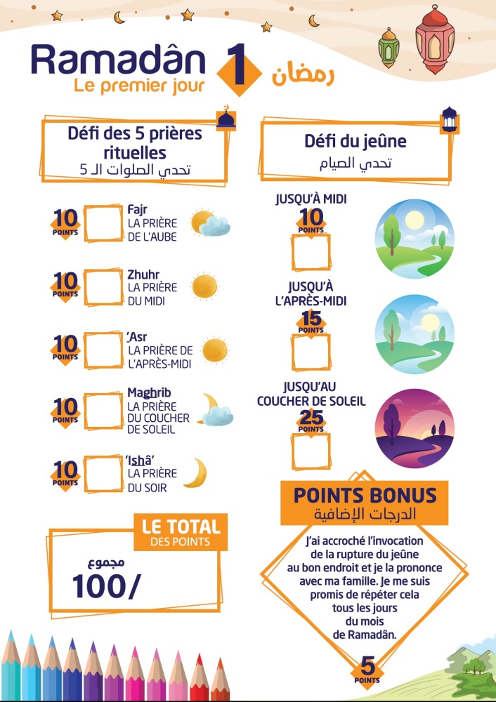 Chaque jour l'enfant va comptabiliser ses points par rapport au "défi des cinq prières quotidiennes" et au "défi du jeûne"... Par ailleurs, il apprendra chaque jour un nouveau hadith du prophète (SAW) ou une information utile sur le Ramadan et pourra réaliser un beau coloriage correspondant... Au total 30 coloriages et activités d'apprentissage pour les 30 jours de Ramadan...
