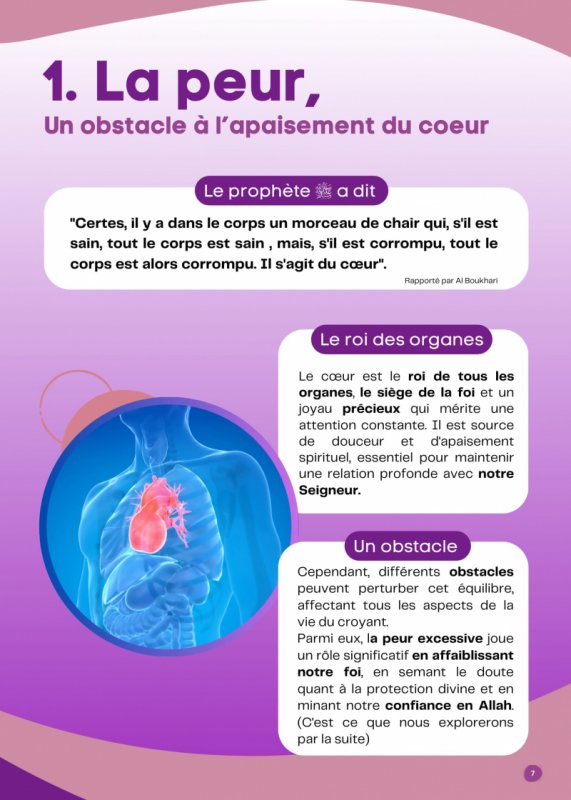 Ce livre explore comment remplacer nos peurs par du courage, en s'appuyant sur les enseignements du Coran et de la Sunna. À travers des conseils pratiques et des sources d'inspiration, il offre des pistes concrètes pour apaiser nos cœurs et surmonter les défis avec une confiance renouvelée en Allah.