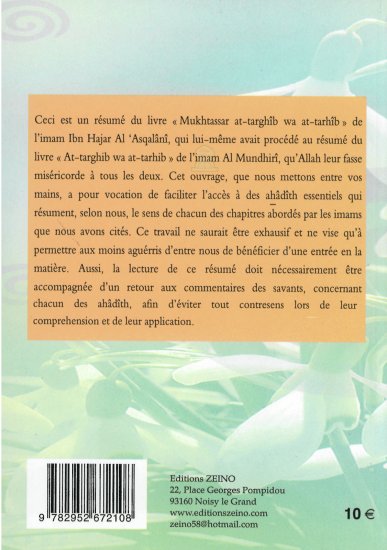Ceci est un résumé du livre " Mukhtassar at-targhîb wa at-tarhîb " de l'imam Ibn Hajar Al 'Asqalânî, qui lui-même avait procédé au résumé du livre " At-targhîb wa at-tarhîb " de l'imam Al Mundhirî, qu'Allah leur fasse miséricorde à tous les deux. Cet ouvrage, que nous mettons entre vos mains, a pour vocation de faciliter l'accès à des ahâdith essentiels qui résument, selon nous,le sens de chacun des chapitres abordés par les imams que nous avons cités.