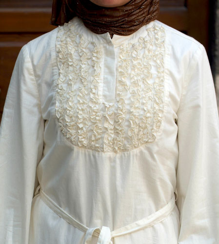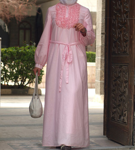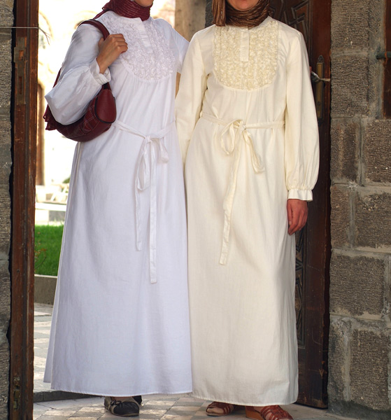 This feminine dress is beautiful, modest, and light. Made from cotton voile, its soft and comfortable design is perfect for relaxing in.