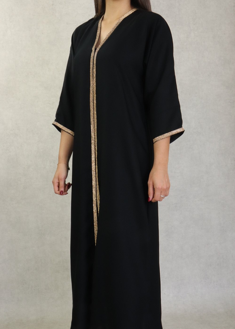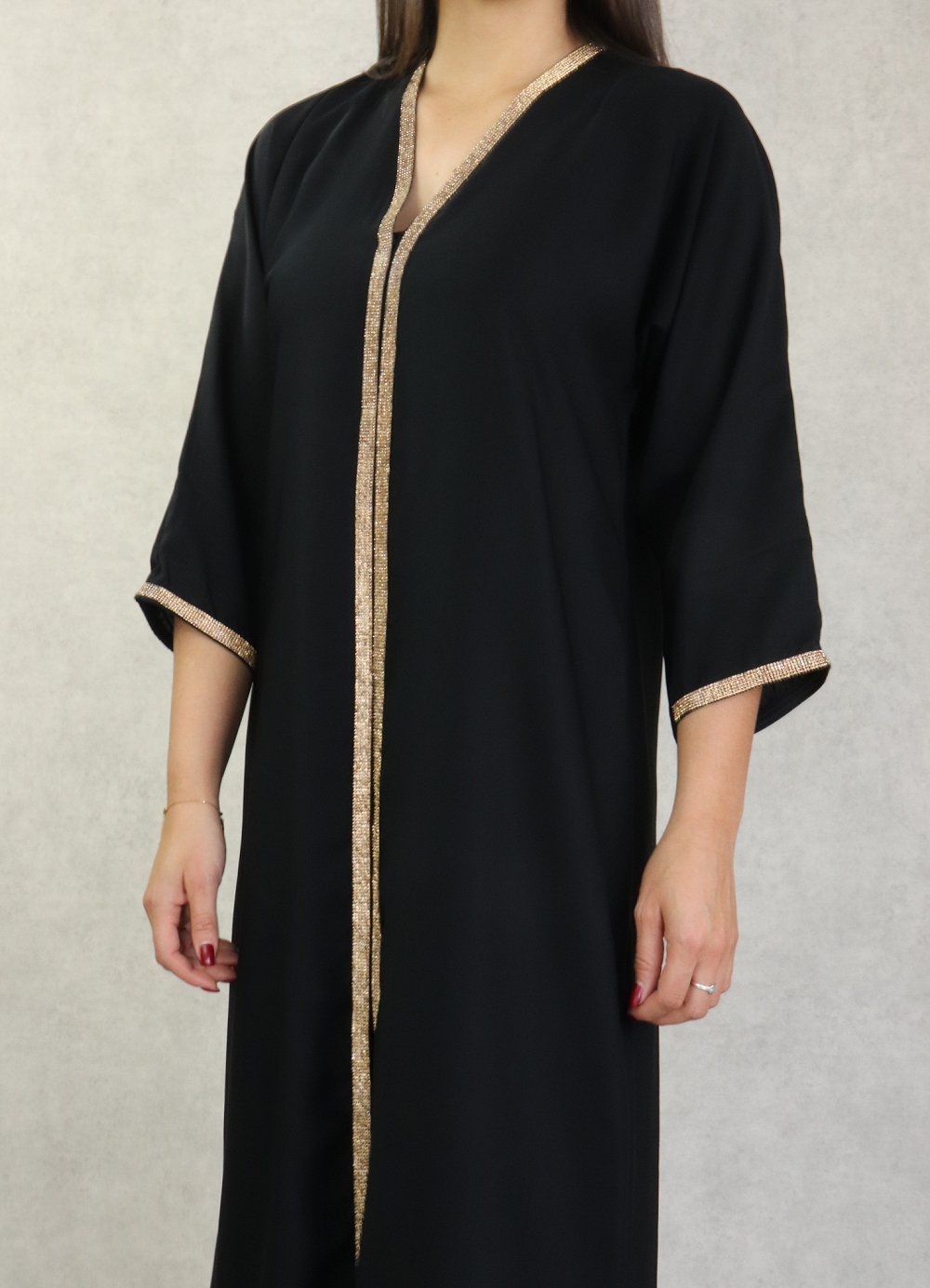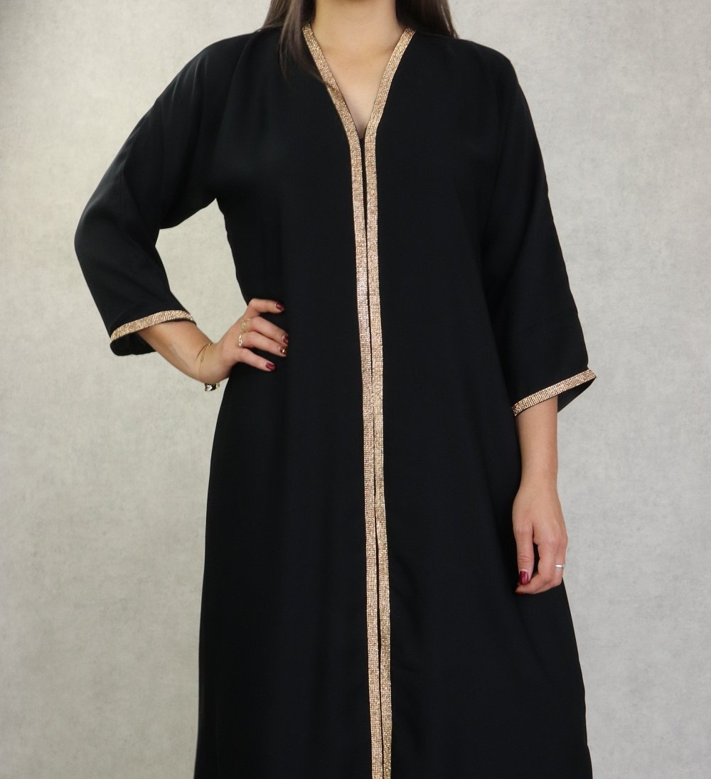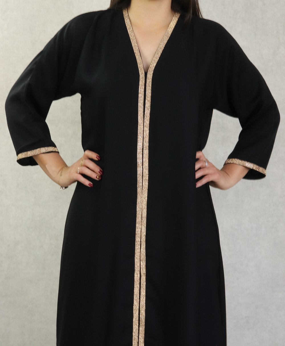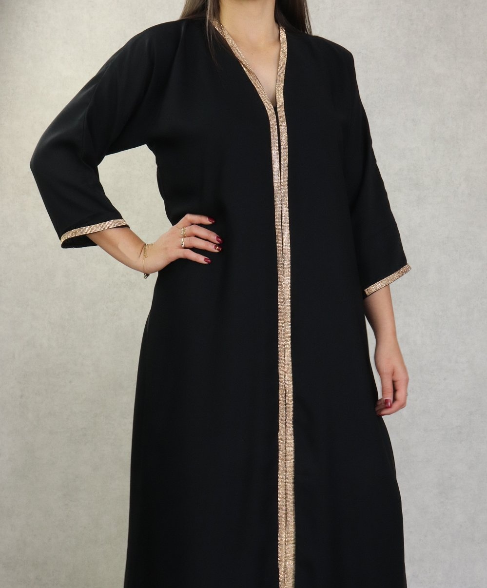 Robe Abaya Dubai de qualite avec motifs strass dores sur le devant et les manches - Couleur noir