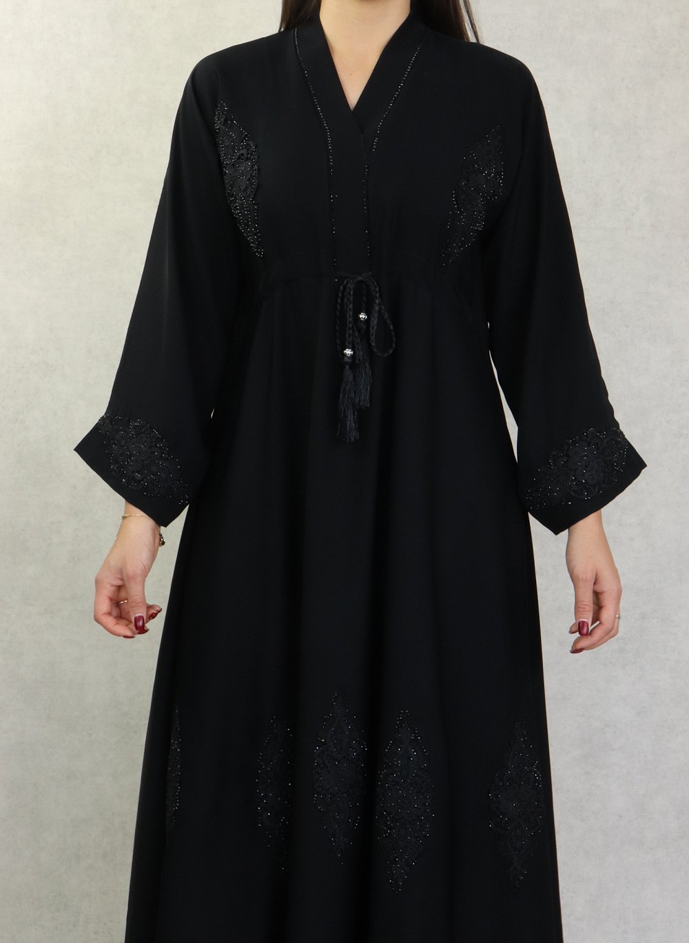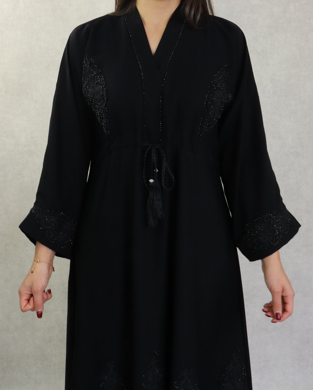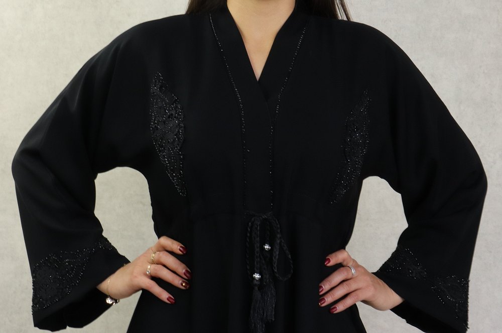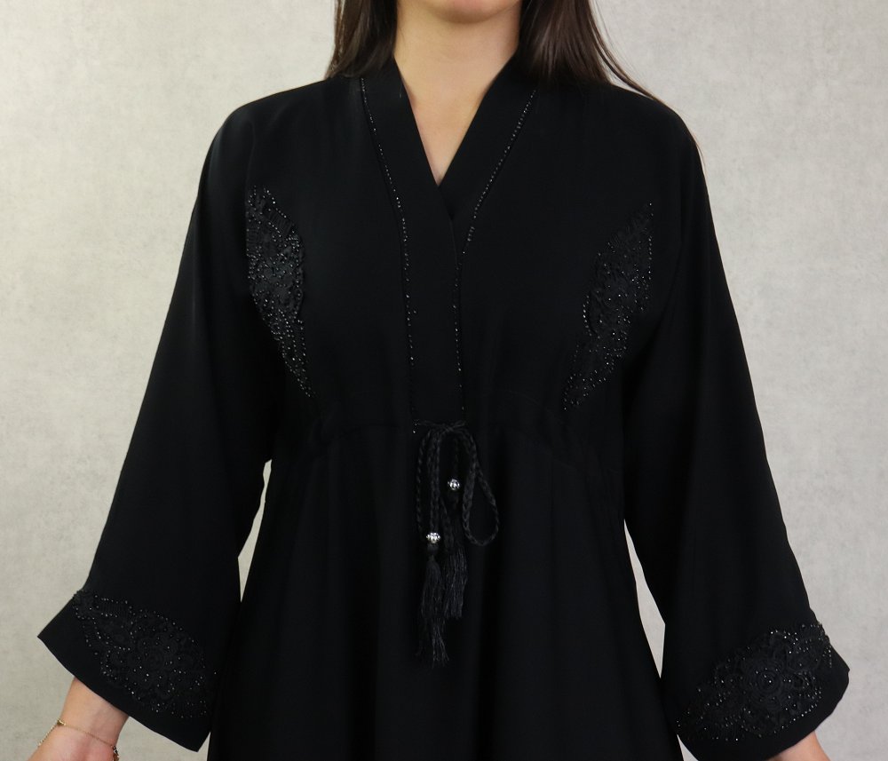Robe Abaya Kimono Dubaï noire de qualité avec ceinture de serrage interne, strass, perles et broderies - REF. 38139 (49.00 €)