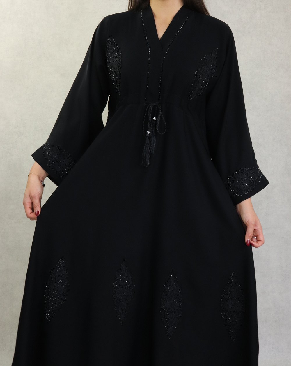 Robe Abaya ample Dubaï noire de qualité avec lien de serrage et nombreuses broderies et strass - REF. 38137 (45.00 €)