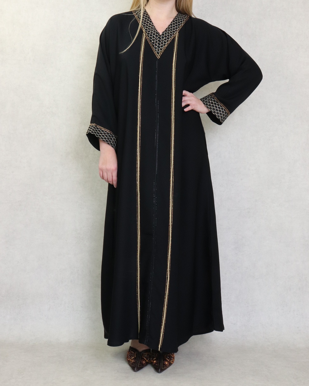 Robe Abaya Dubaï noire de qualité avec bande brodée et strass idéale pour la fête de l'Aïd 2025 - REF. 38128 (45.00 €)