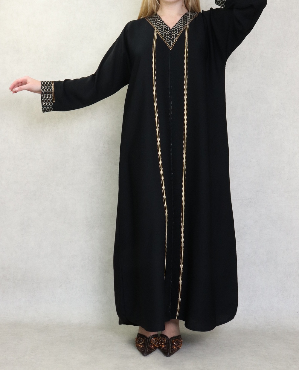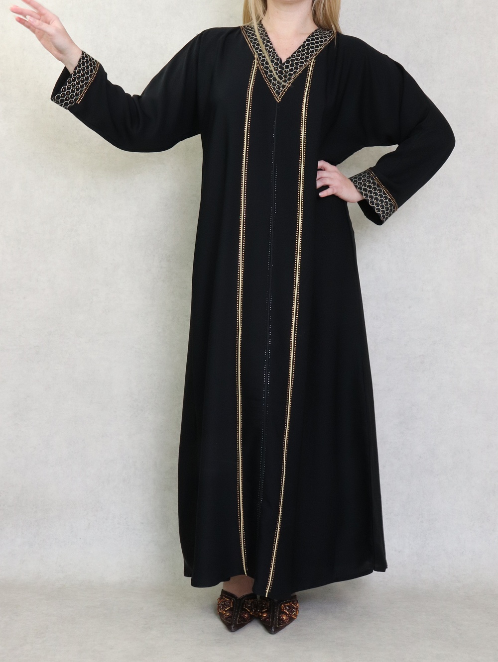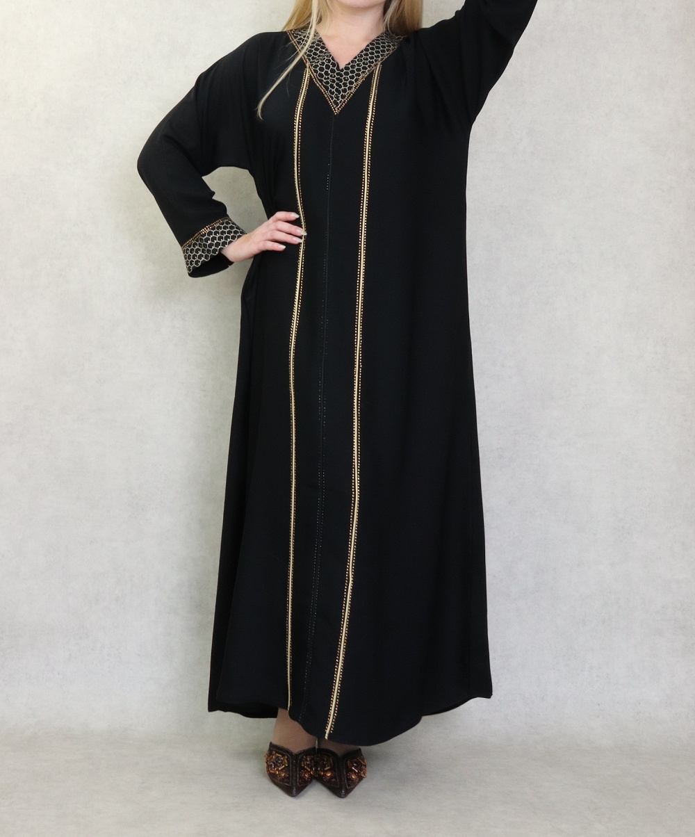 Robe Abaya Dubaï de qualité avec motifs strass dorés sur le devant et les manches - Couleur noir - REF. 38179 (39.90 €)