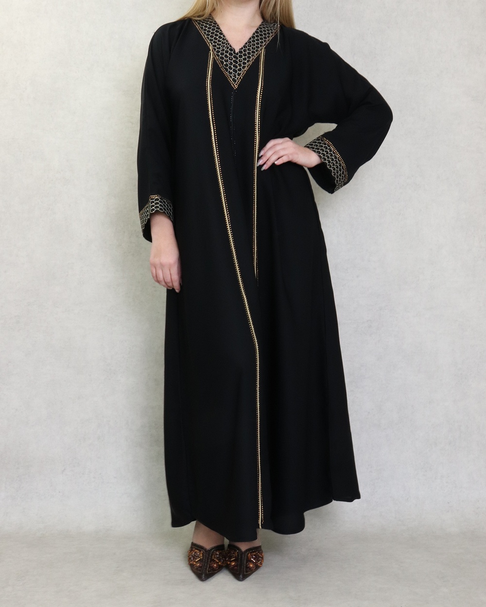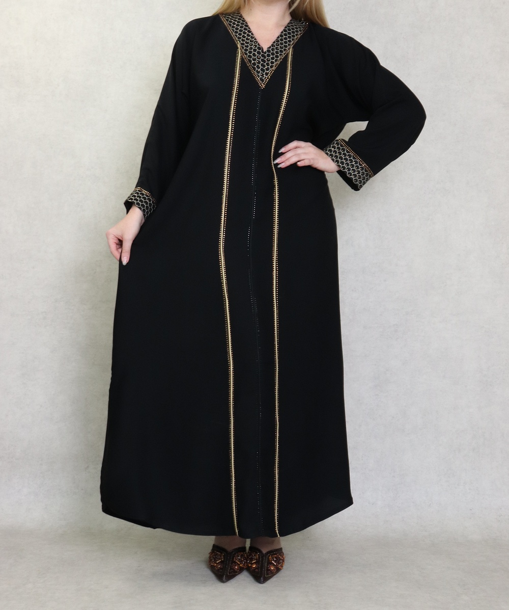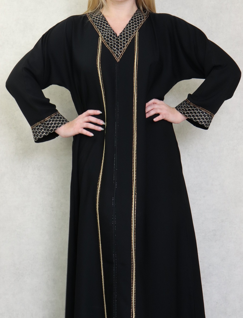 Robe Abaya Dubaï de qualité avec motifs strass dorés sur le devant et les manches - Couleur noir - REF. 38179 (39.90 €)