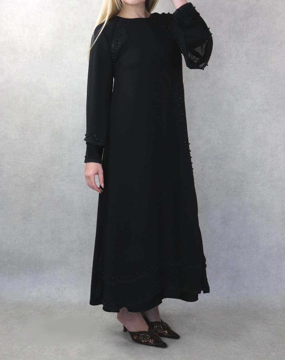 Robe Abaya Dubai noire de qualite avec nombreuses perles noires et strass