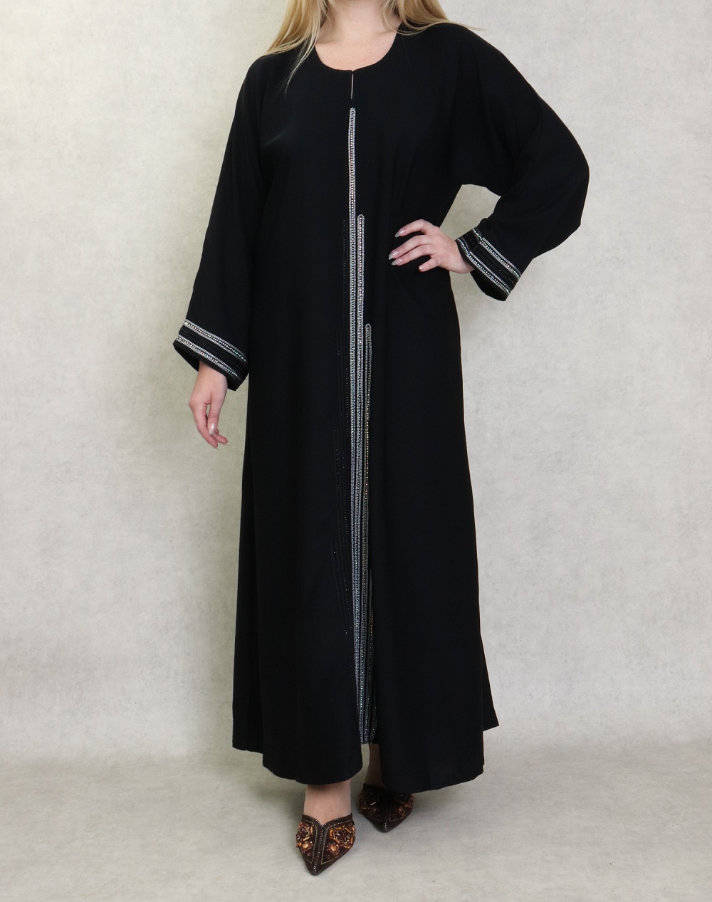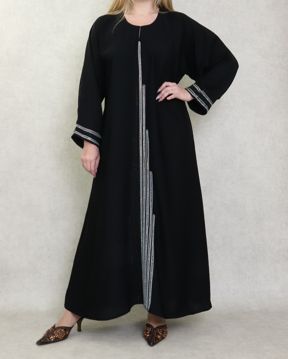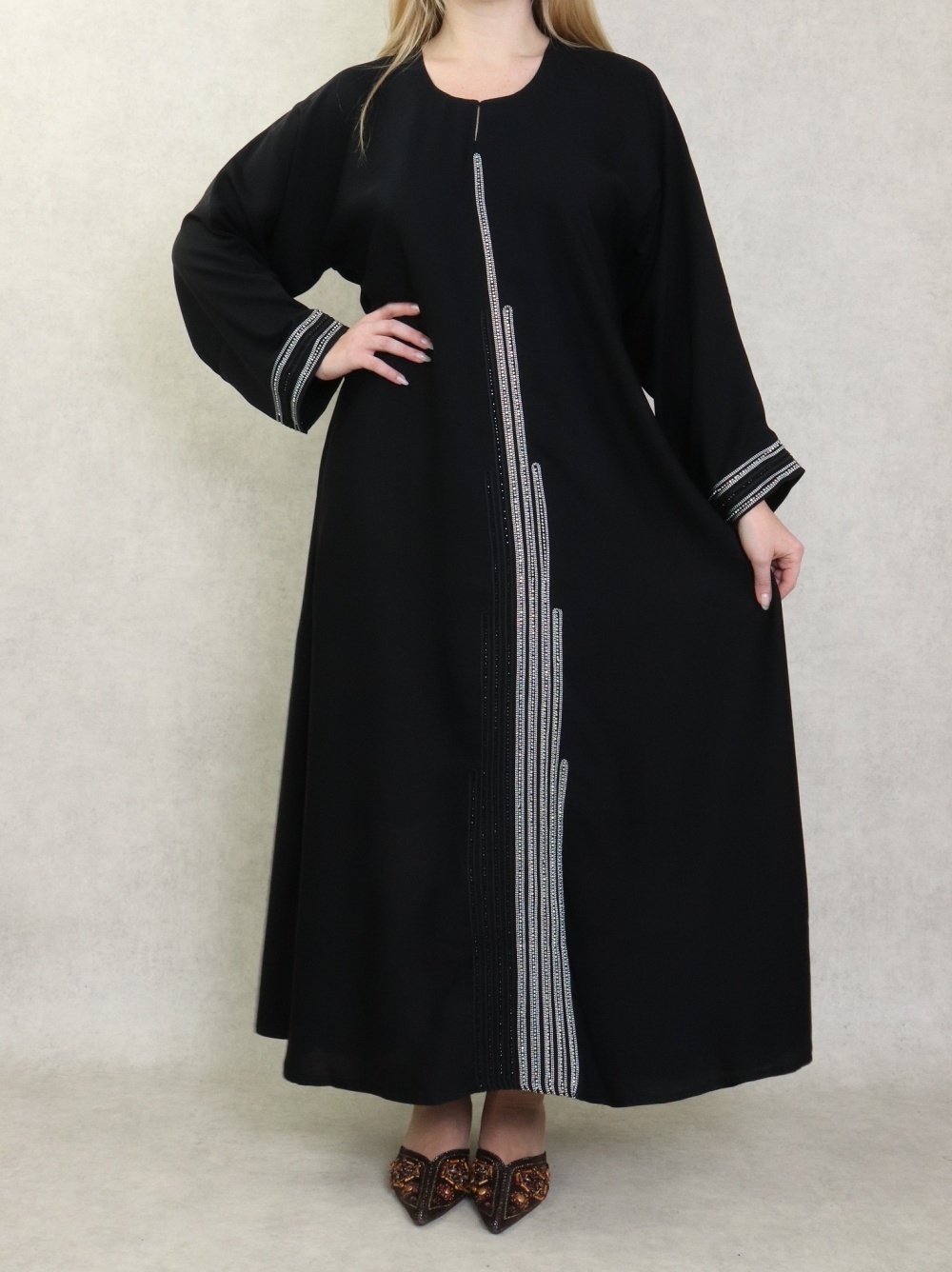 Robe Abaya Dubaï noire de qualité avec bande brodée et strass idéale pour la fête de l'Aïd 2025 - REF. 38128 (45.00 €)