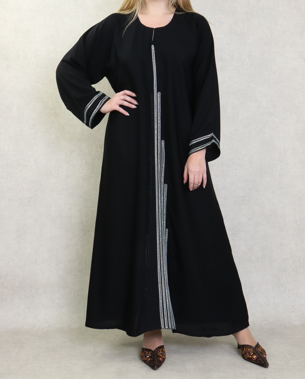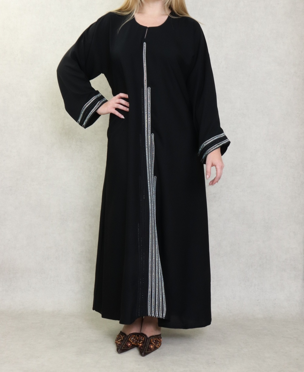 Robe Abaya Dubaï noire de qualité avec bande brodée et strass et perles argentées - REF. 38189 (45.00 €)