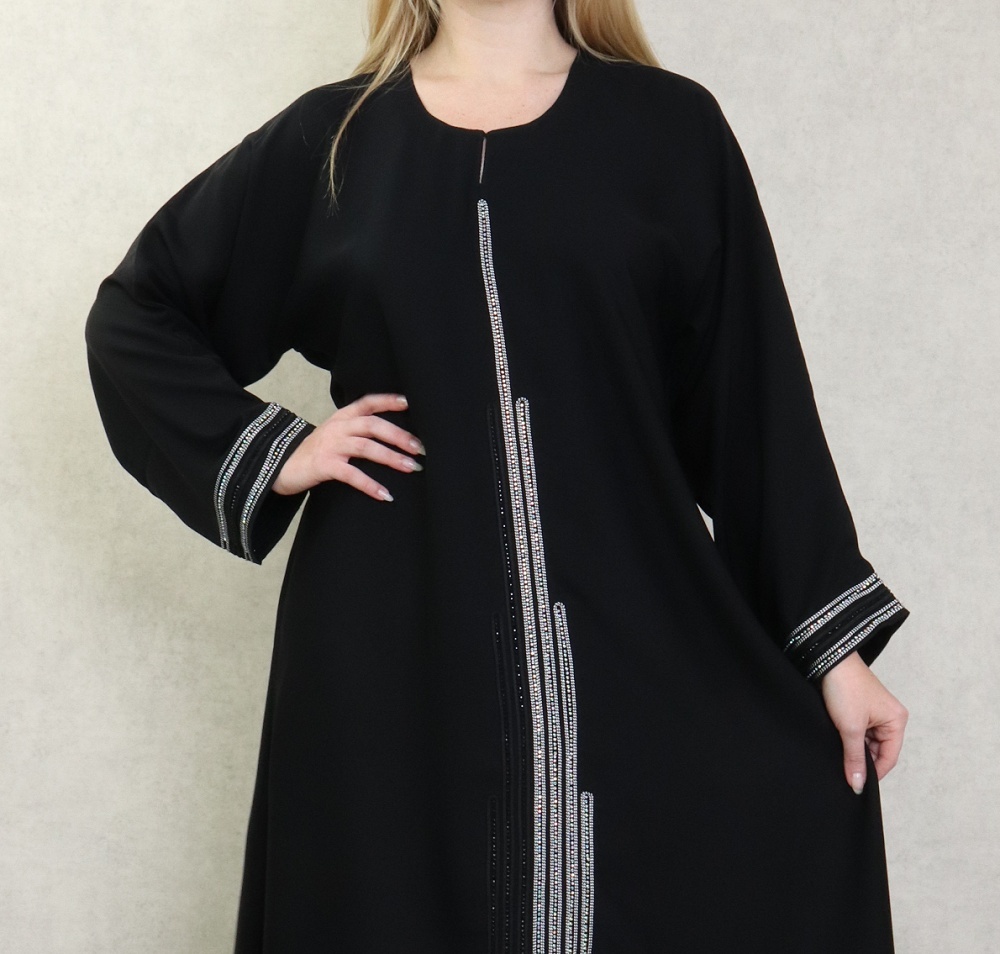 Robe Abaya Dubaï noire de qualité avec strass modèle Burj Khalifa en strass et diamant noirs et blancs - REF. 38144 (45.00 €)
