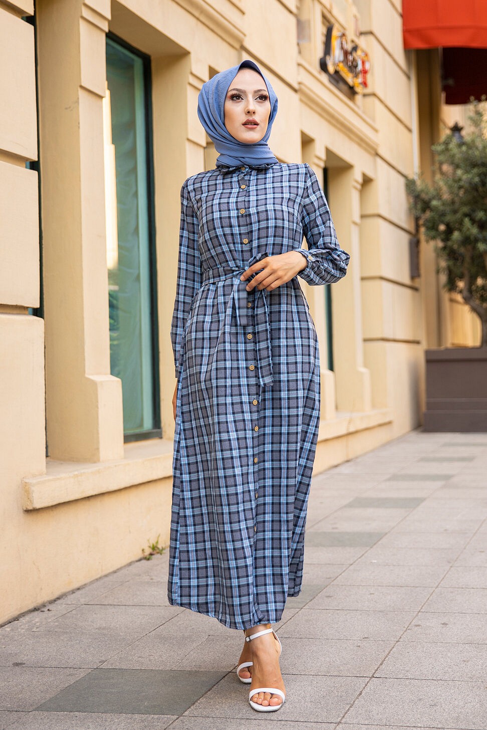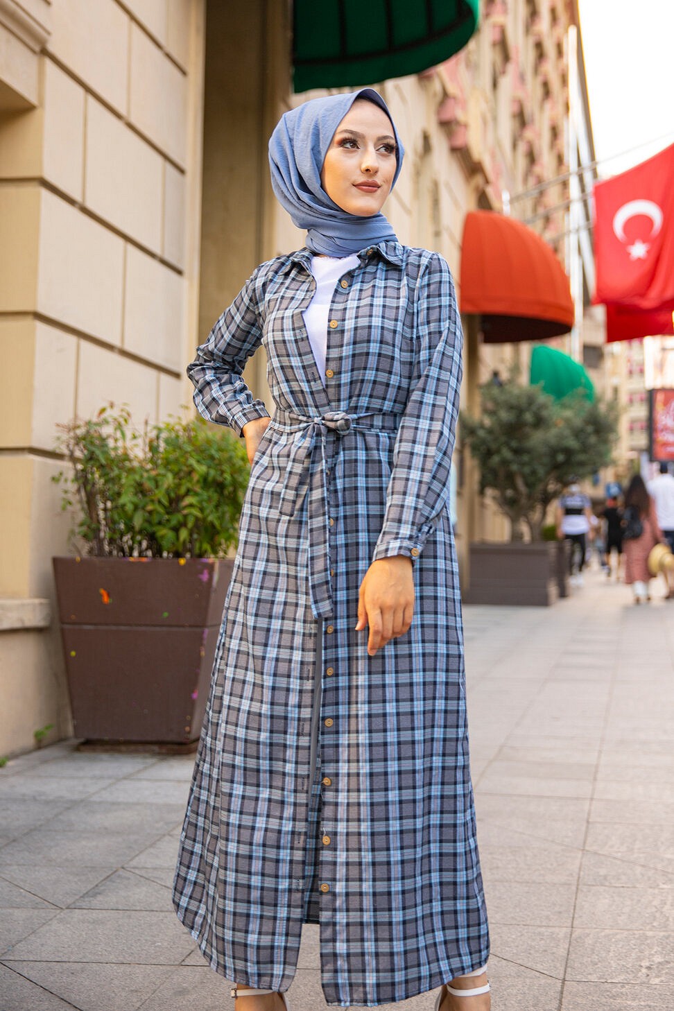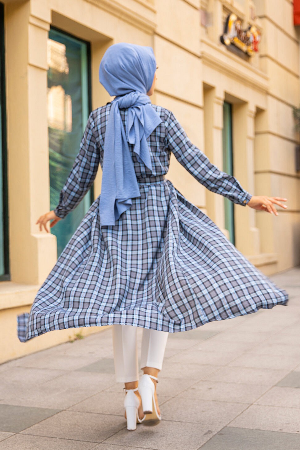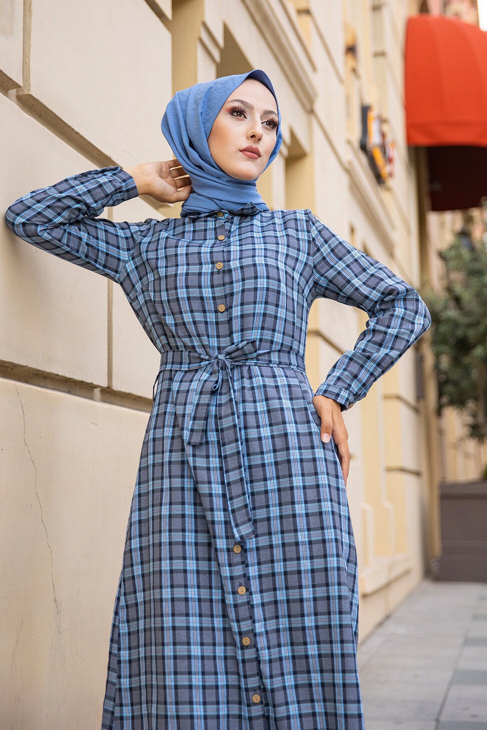 Robe-Chemise boutonnee ecossaise longue avec ceinture assortie pour femme (Vetement Modest Fashion) - Couleur bleu clair