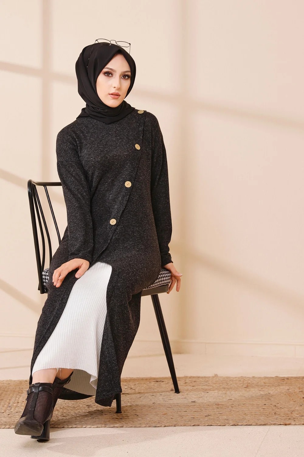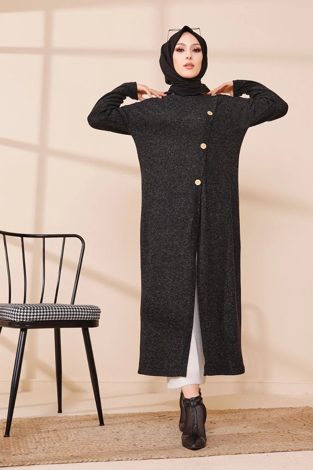 Veste - Tunique longue avec lien de serrage à la taille (Vêtement femme voilée chic) - Couleur noir - REF. 36244 (28.00 €)