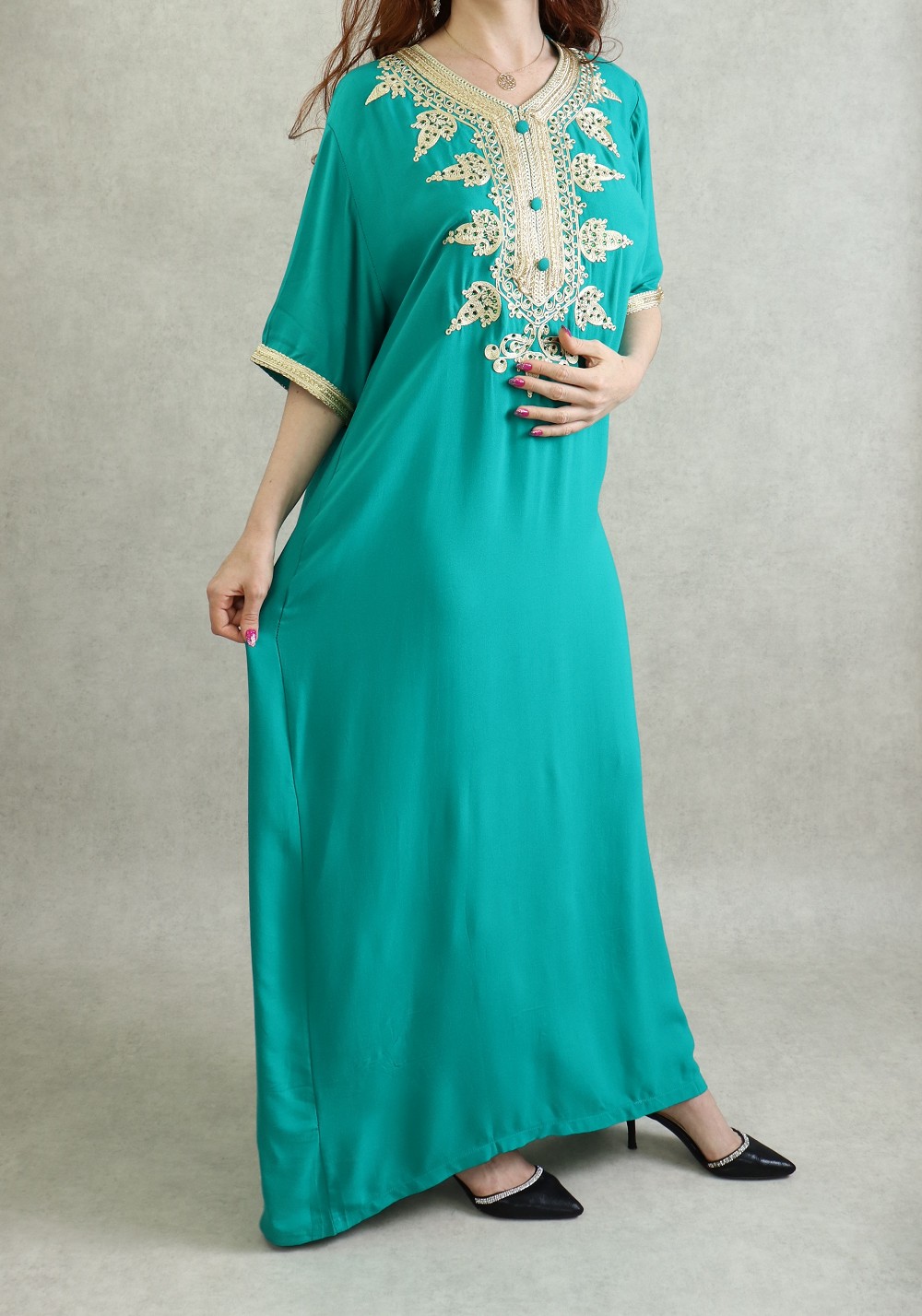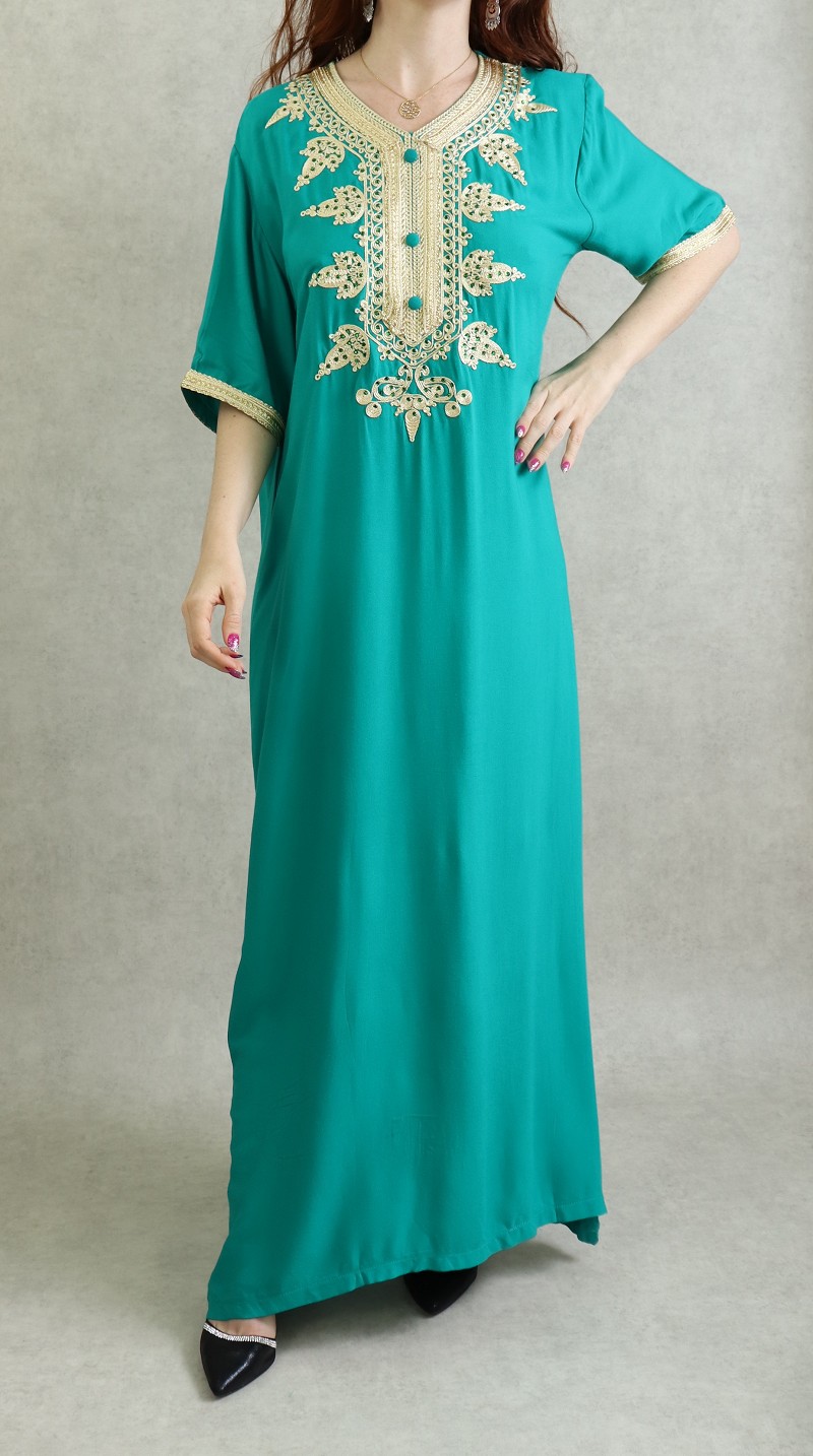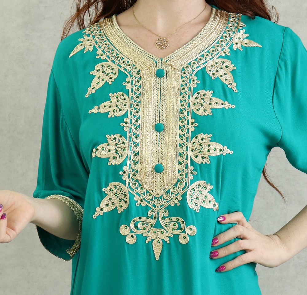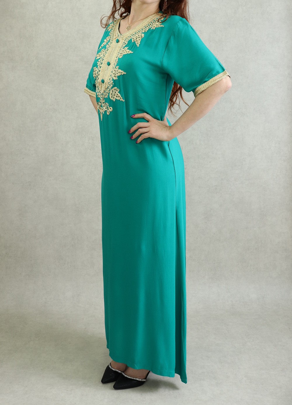 Très Belle robe algérienne. Robe longue manches courtes et broderies dorées sur le col et les manches, accompagnés de quelques strass.