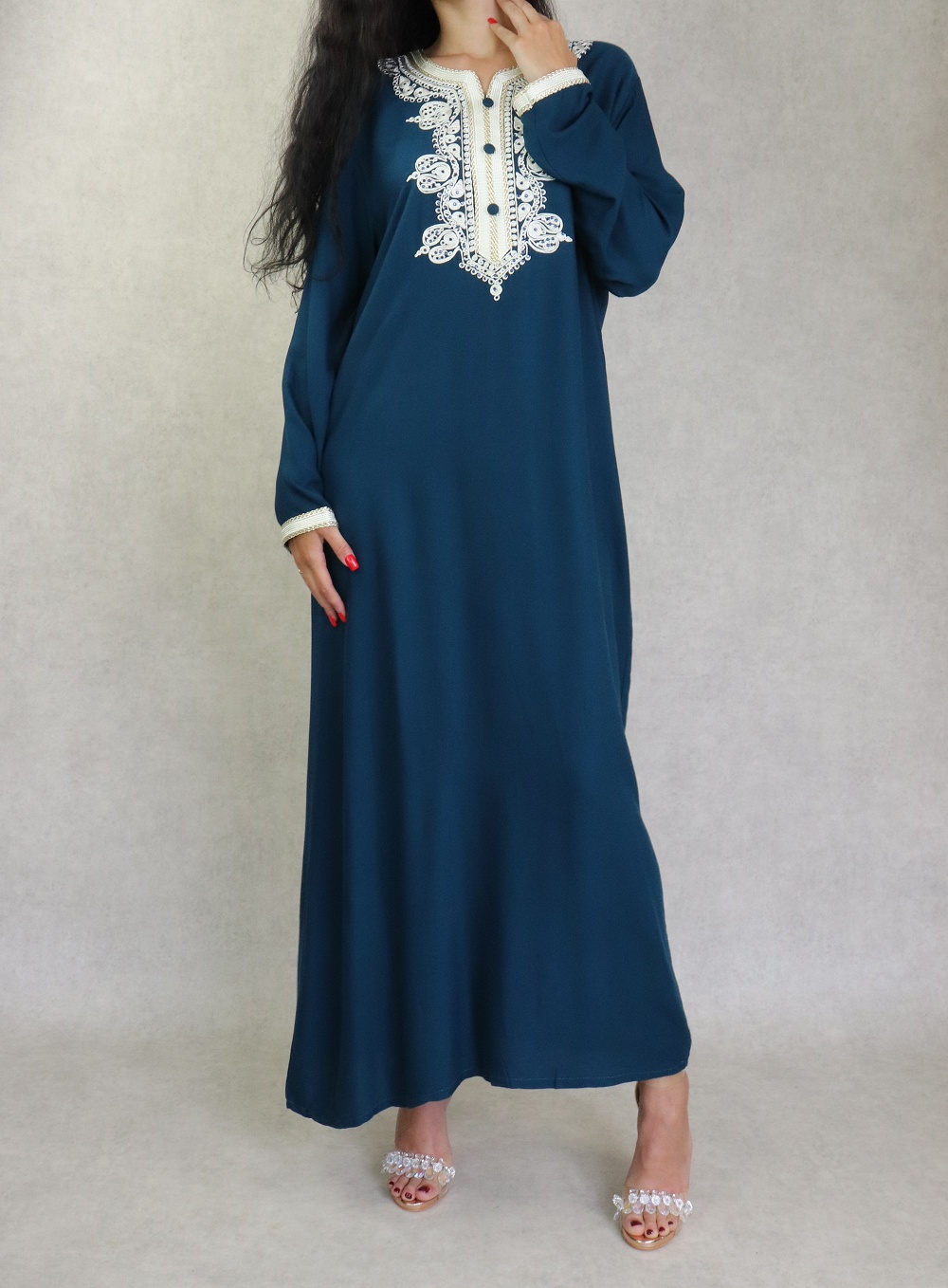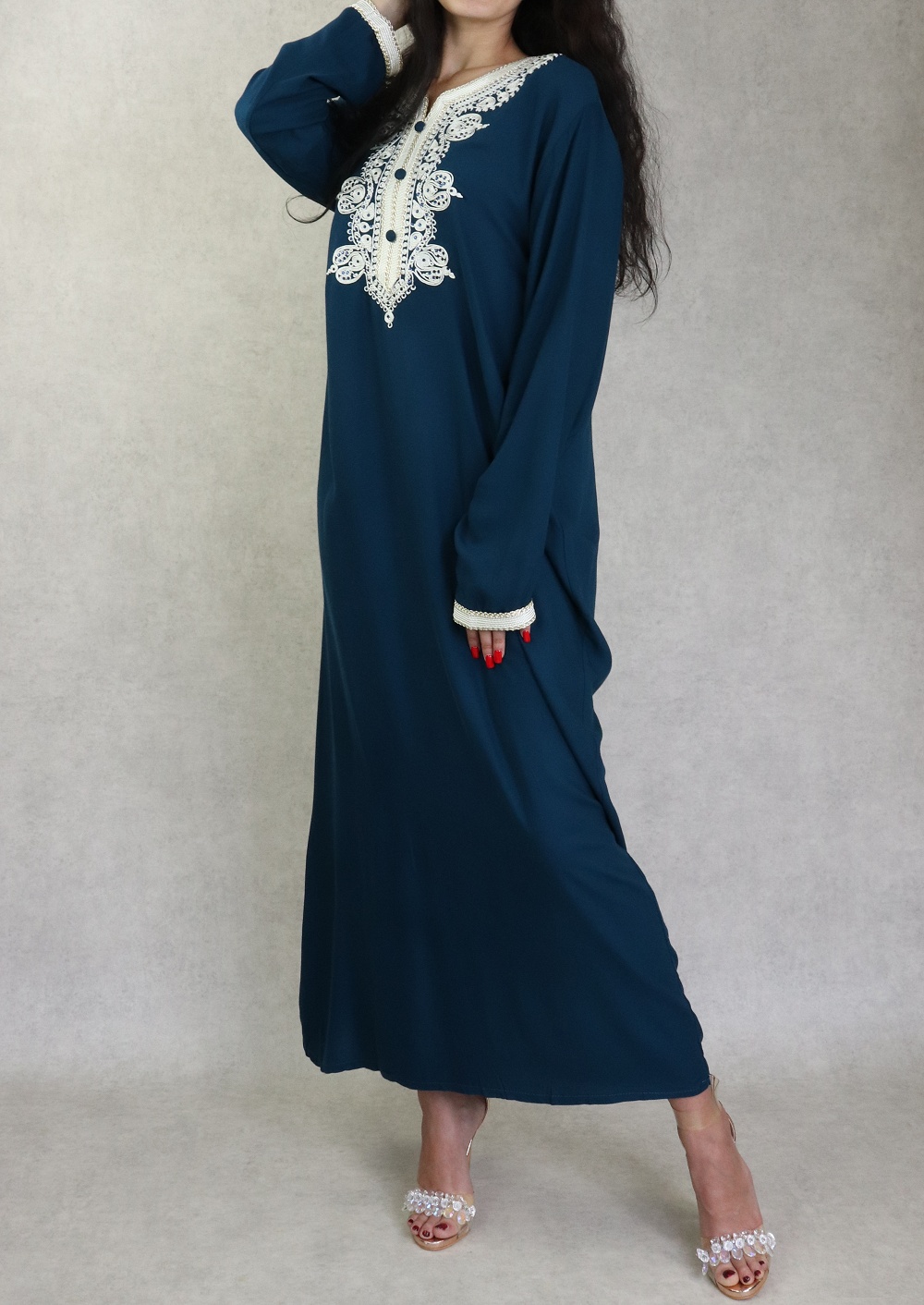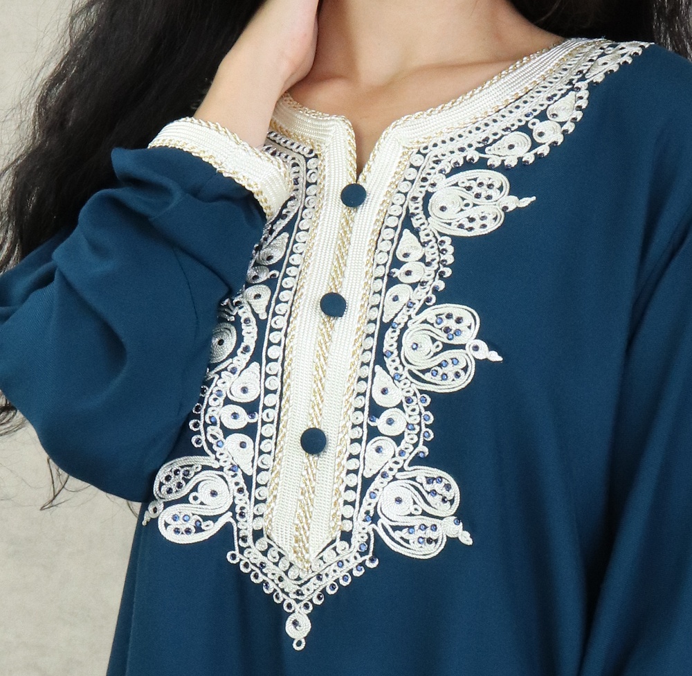 Robe Orientale pour femme avec broderies et strass - Couleur bleu petrole