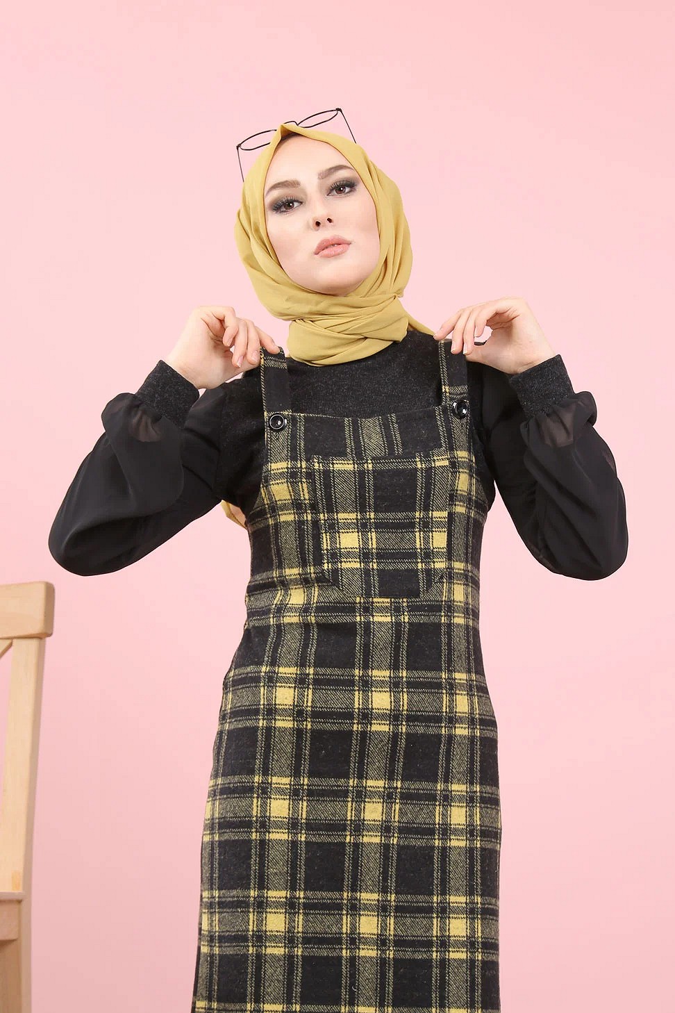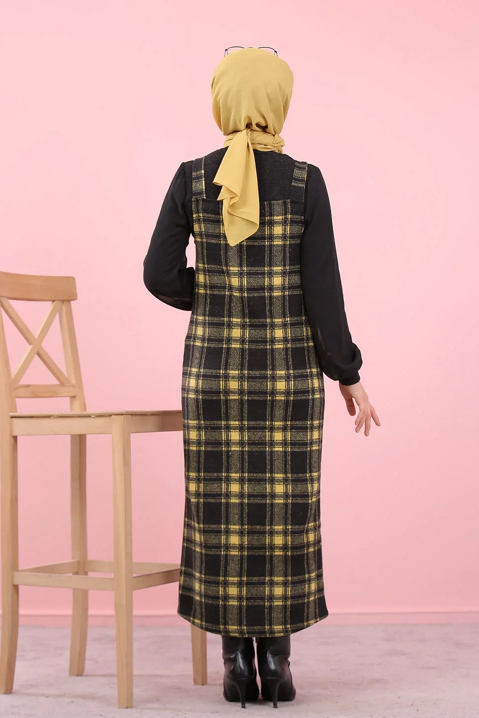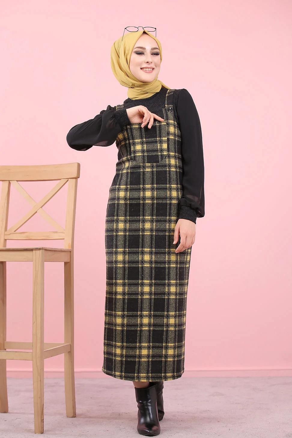 Robe Salopette à carreaux (Tenue Hijab Saion Automne-Hiver pour femme voilee) - Couleur Jaune et noir Vetement & Accessoire