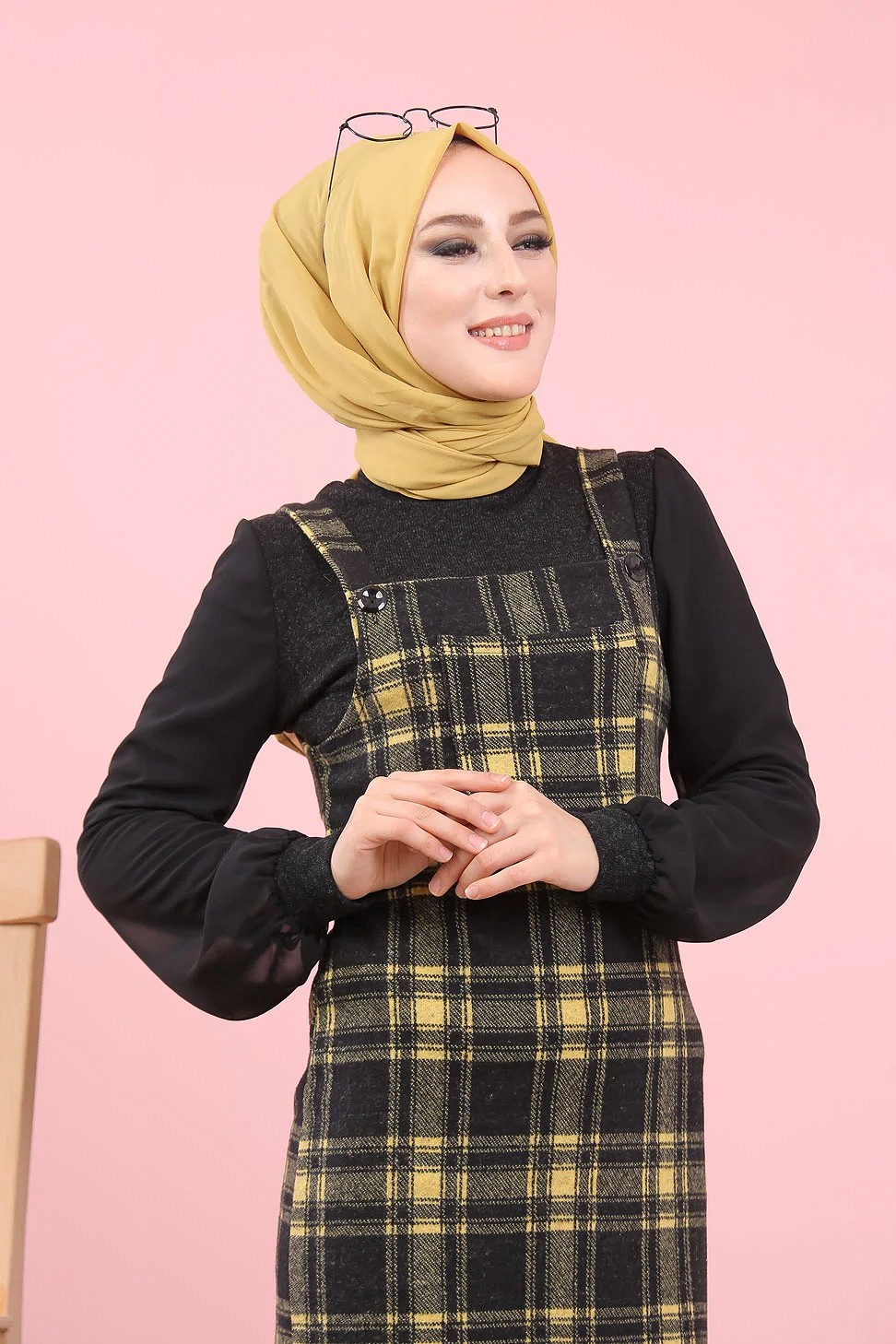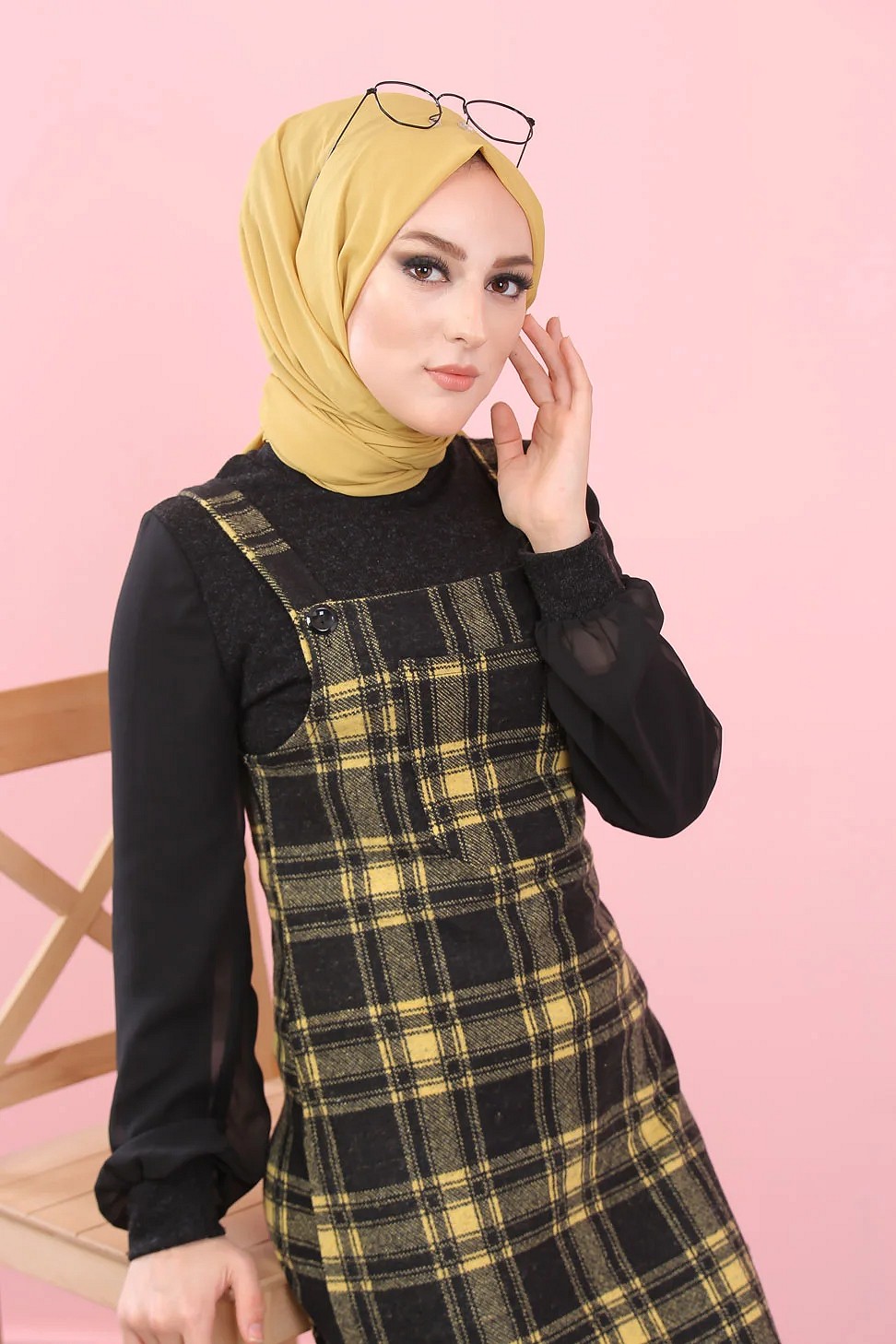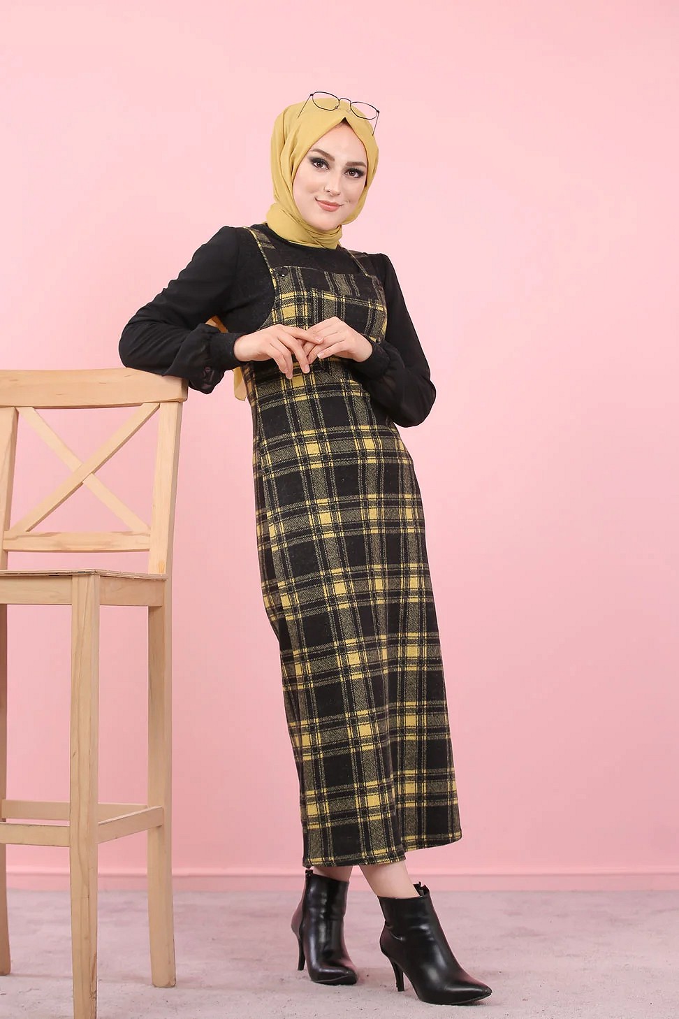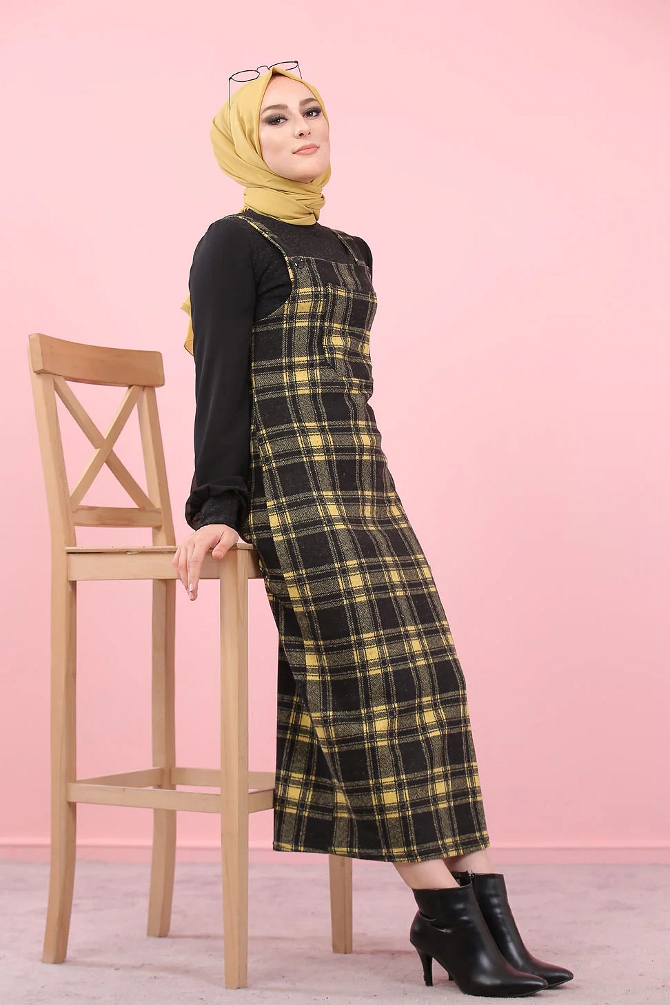 Robe Salopette à carreaux (Tenue Hijab Saion Automne-Hiver pour femme voilee) - Couleur Jaune et noir Vetement & Accessoire