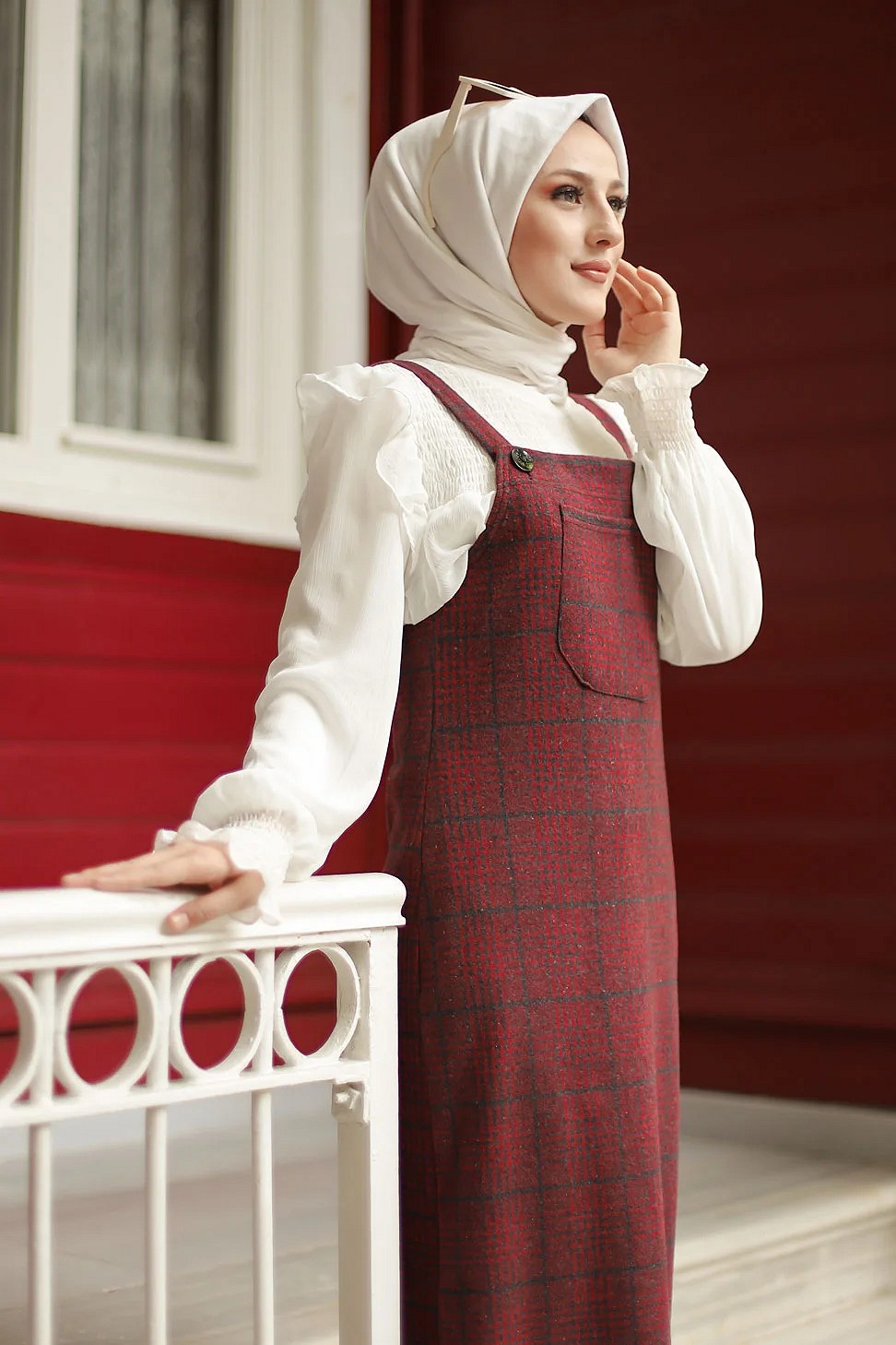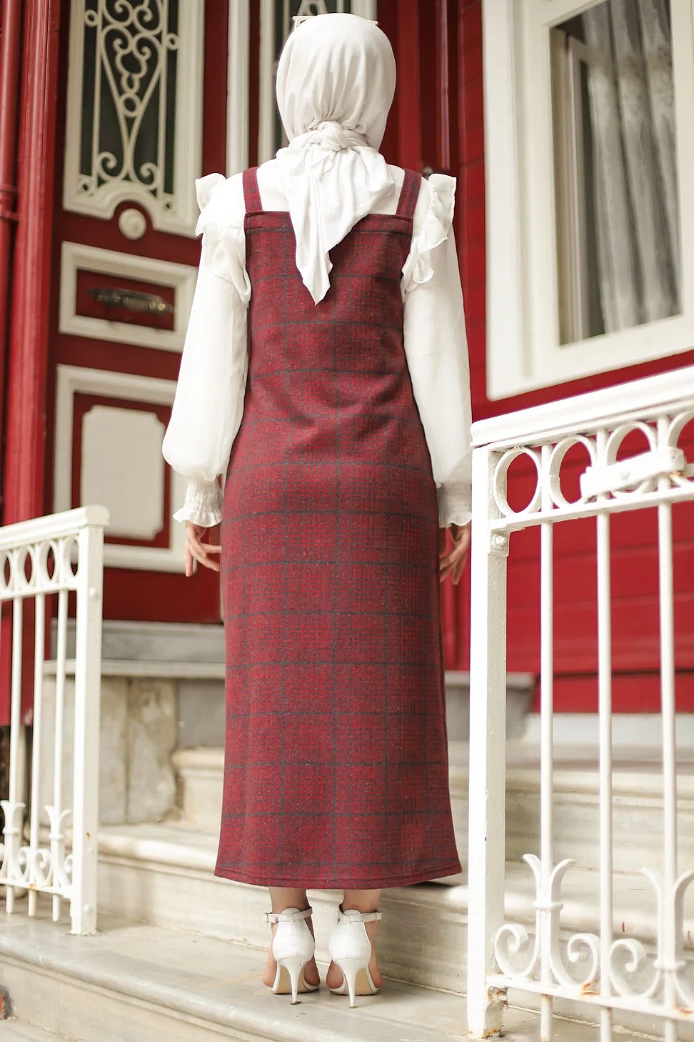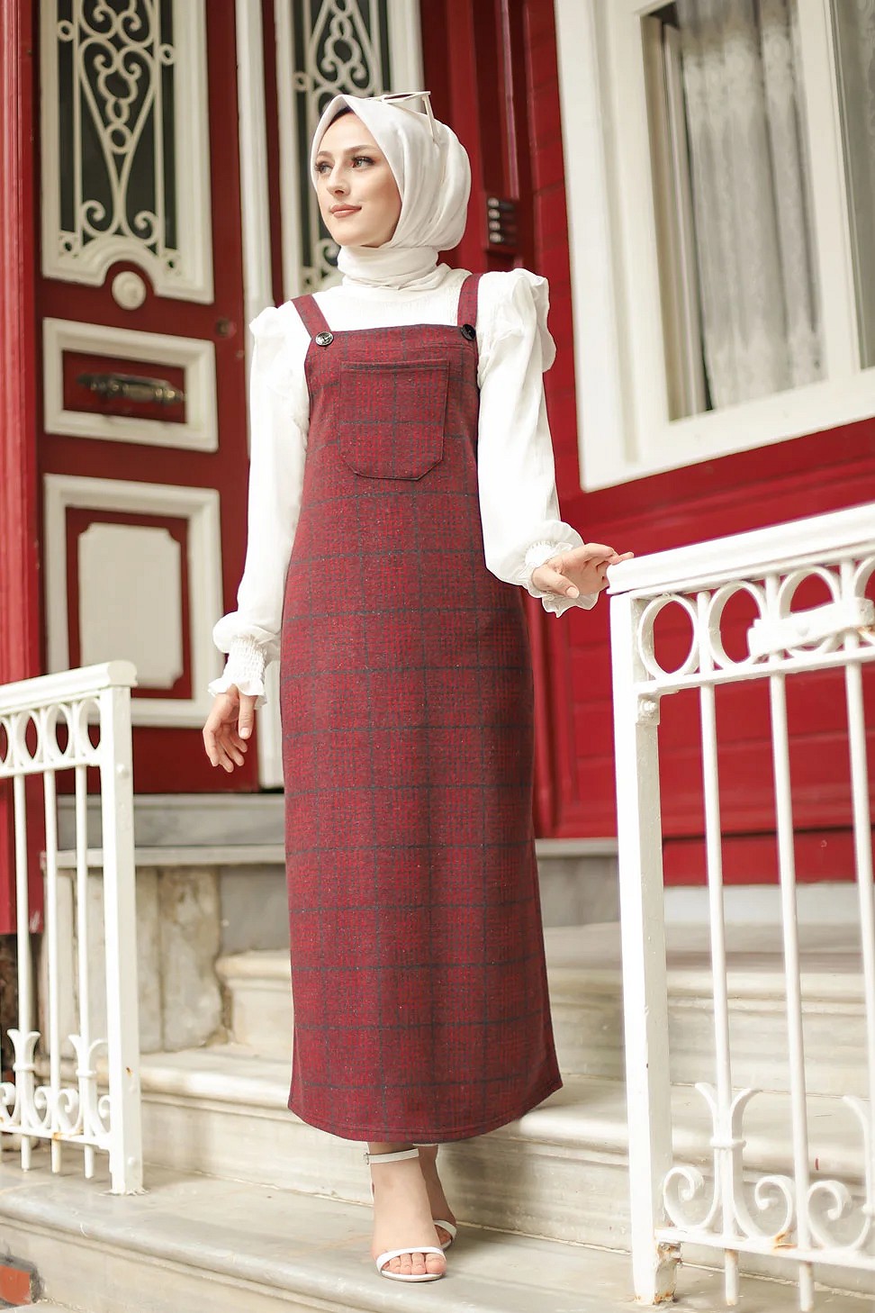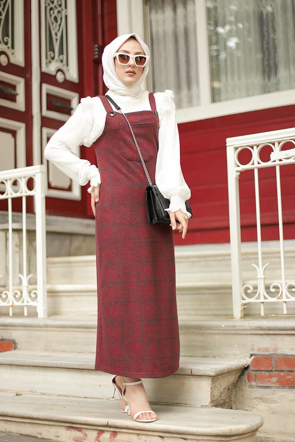 Robe Salopette à carreaux (Tenue Hijab et Modest Fashion pour femme) - Couleur bordeaux et gris Vetement & Accessoire