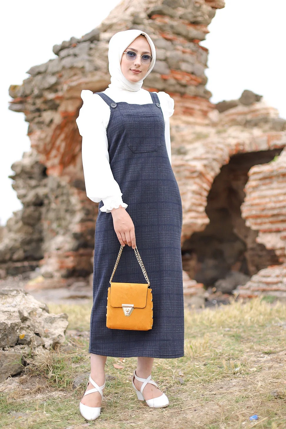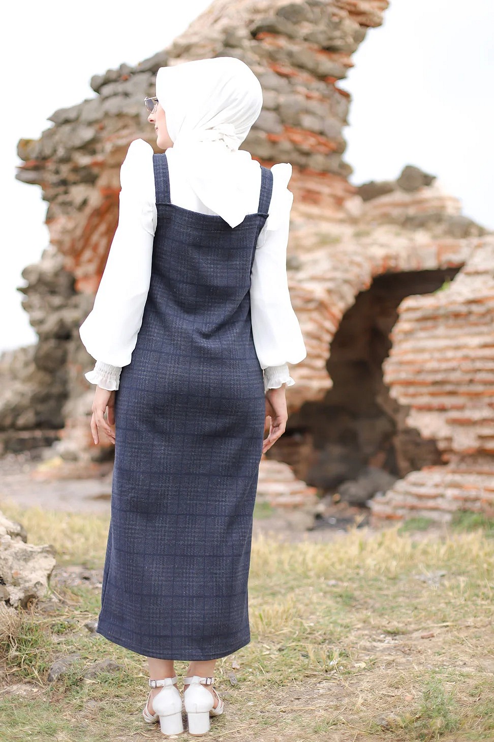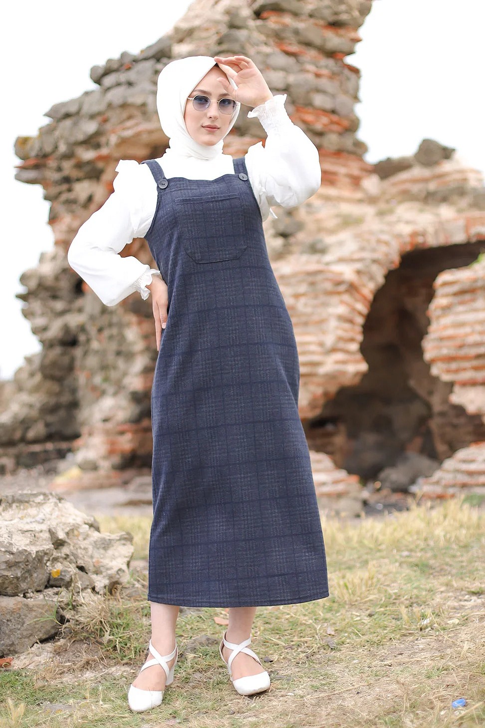Robe Salopette à carreaux pour femme (Tenue Hijab et Modest Fashion) - Couleur bleu et gris Vetement & Accessoire
