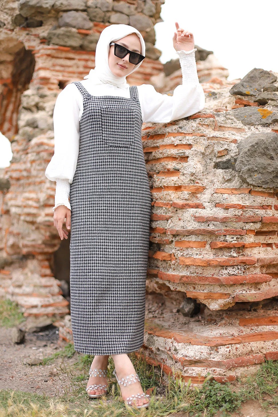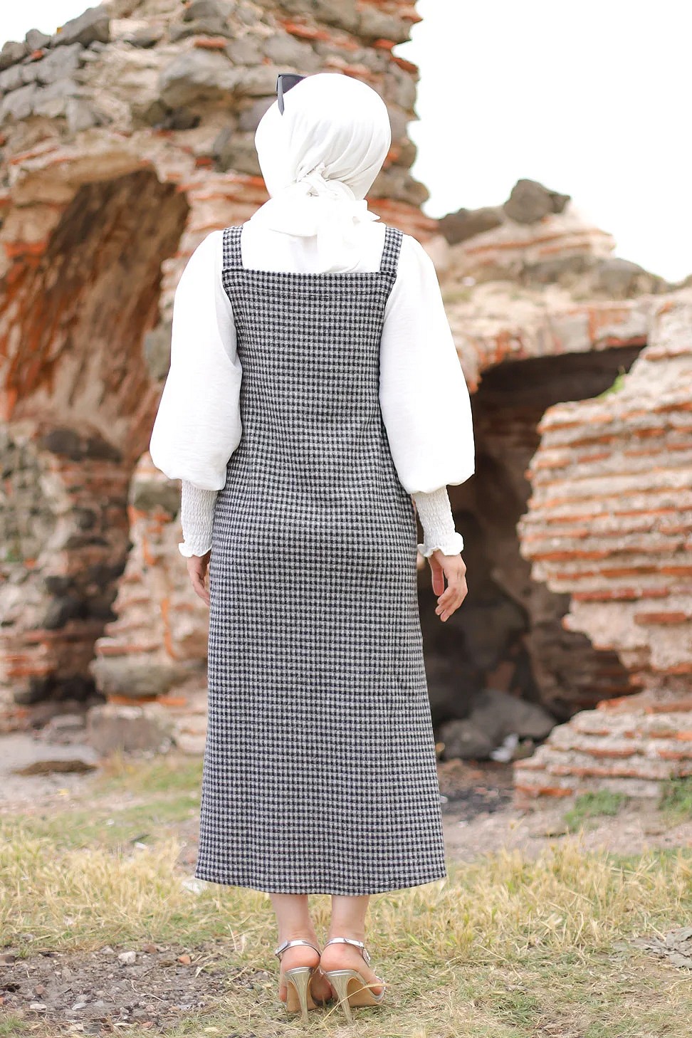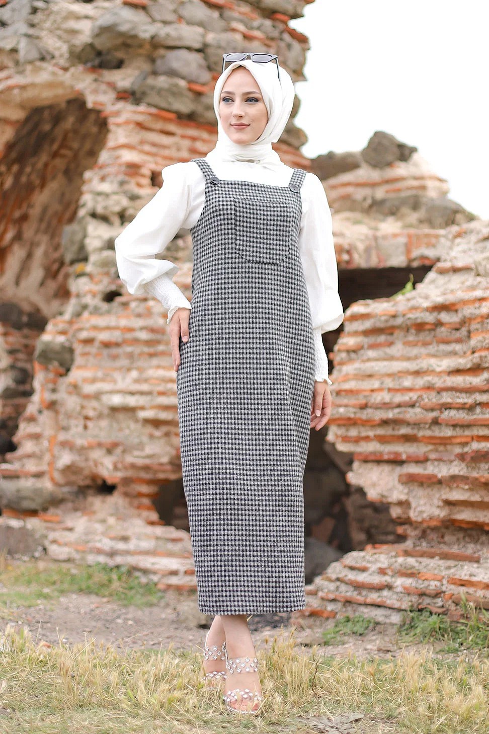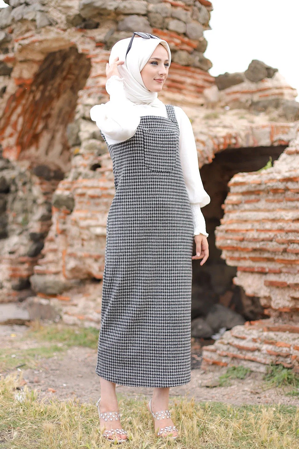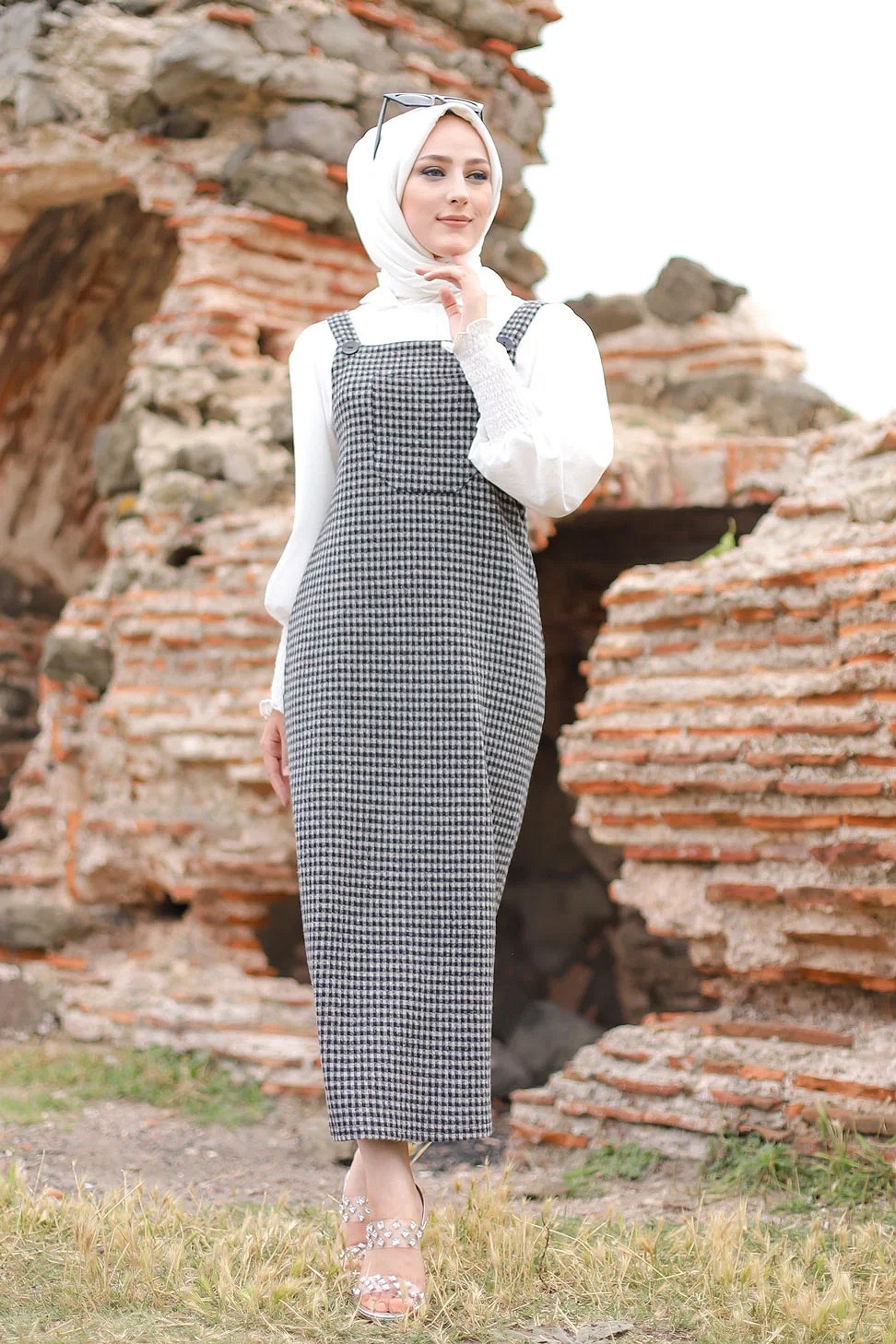 Robe Salopette femme à carreaux de couleur noire et kaki (Tenue Hijab et Modest Fashion) - REF. 32216 (18.00 €) - En Promotion à 14.90 €