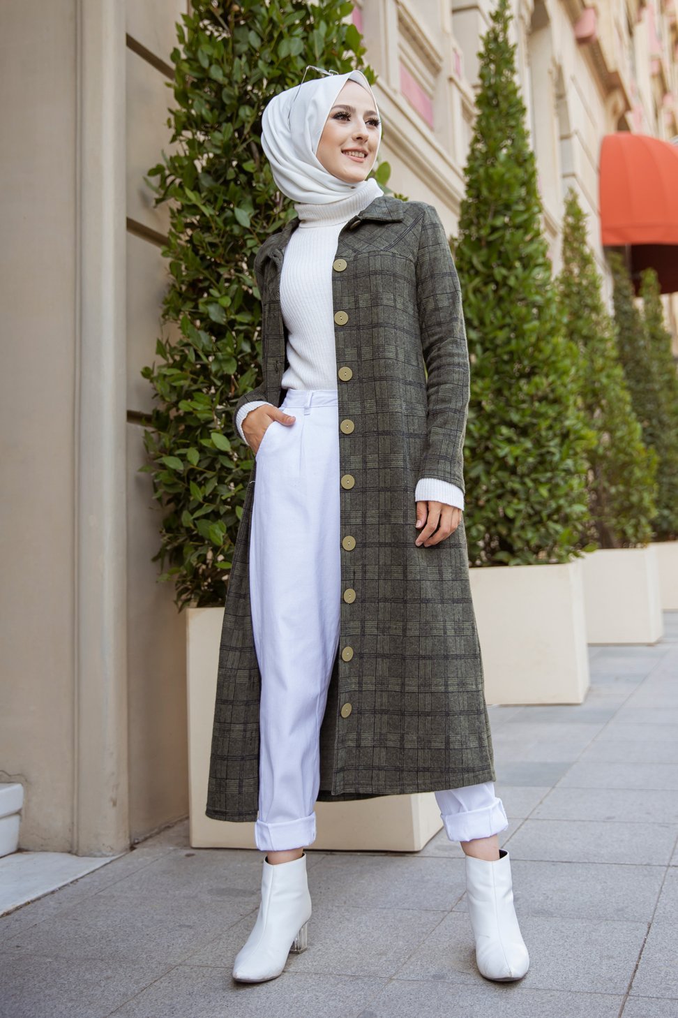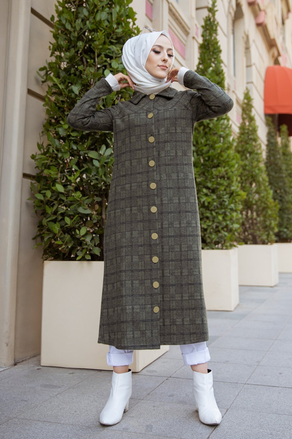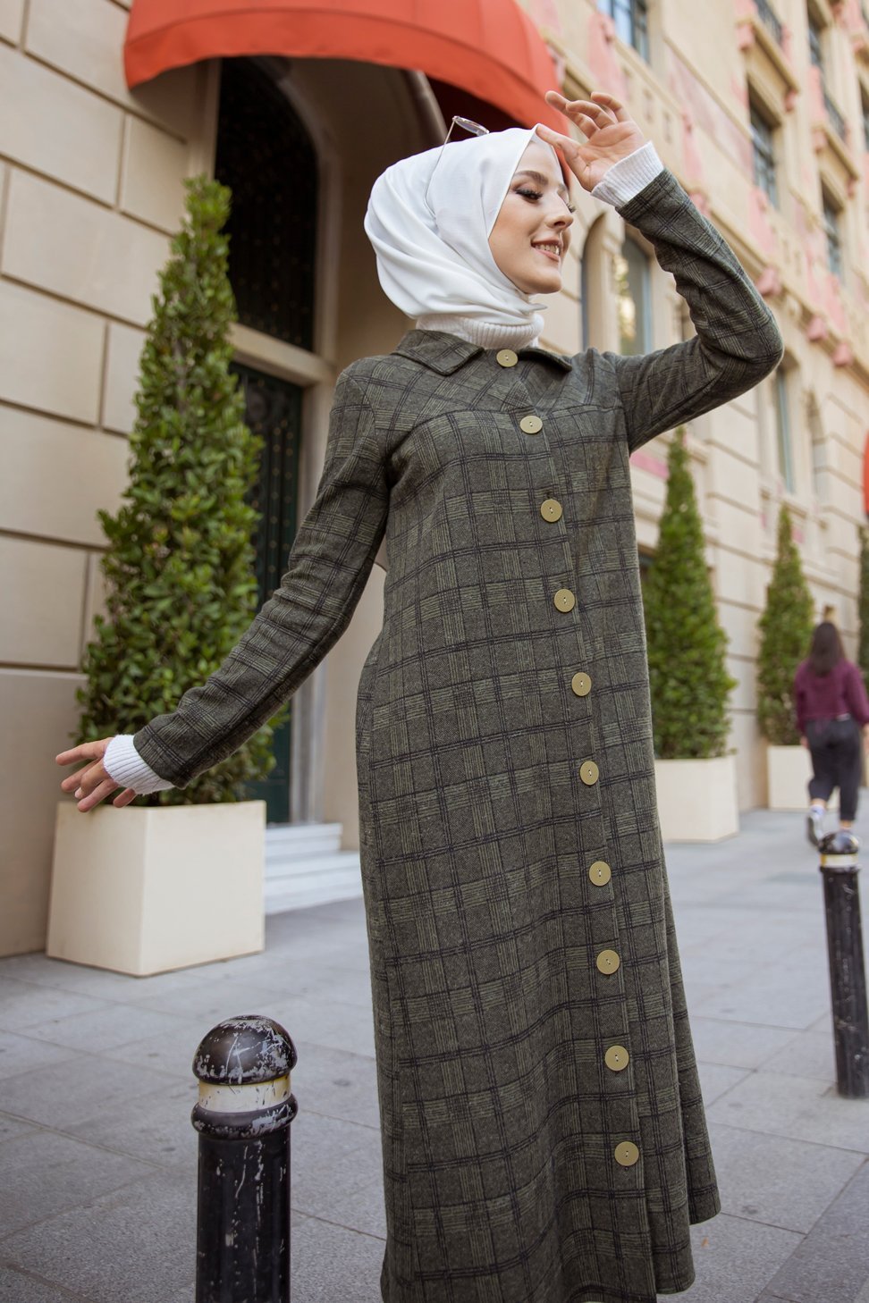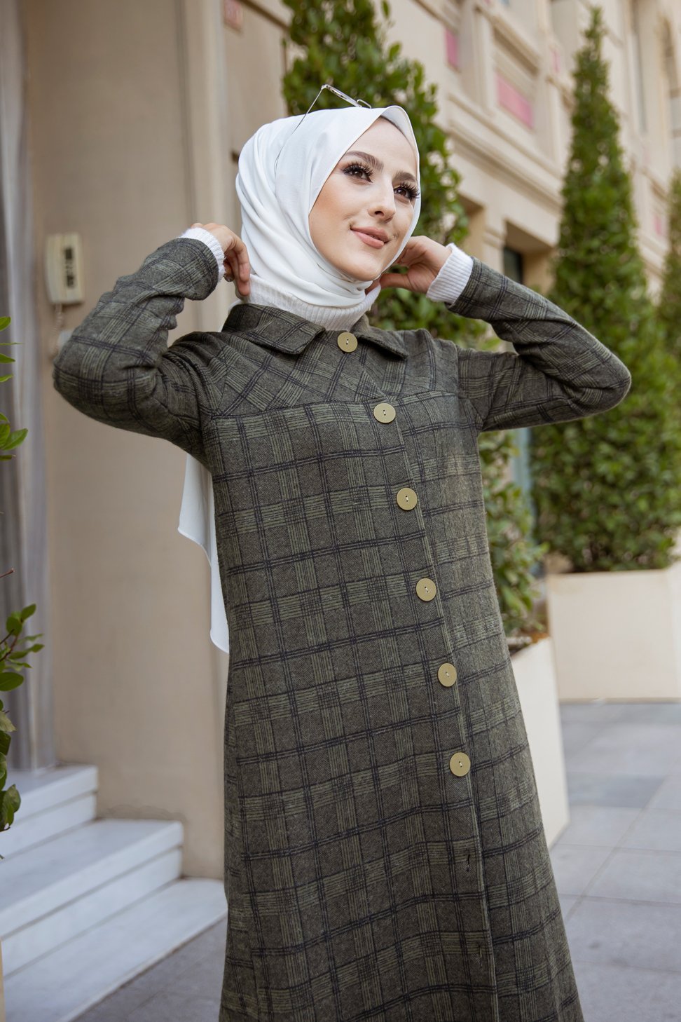 Robe-manteau boutonnée avec grandes poches et capuche (Vêtement mastour pour hijab) - Couleur kaki - REF. 36373 (29.90 €)