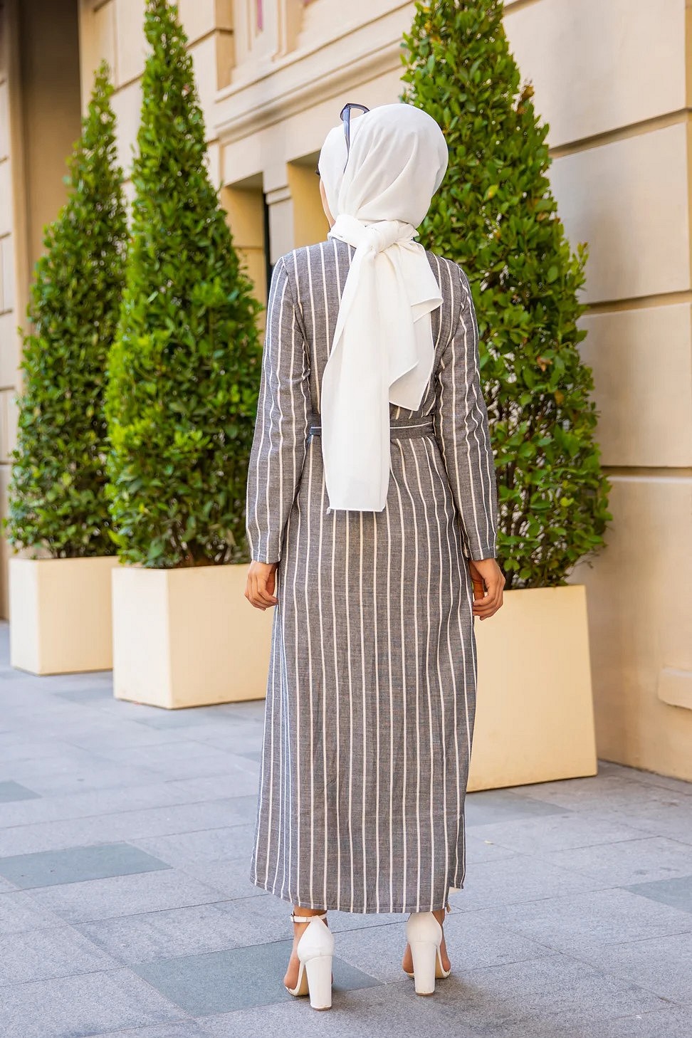 Robe a rayure boutonnee (ouverte) sur toute la longueur avec ceinture assortie pour femme (Vetement hijab ete) - Rayures Bleues