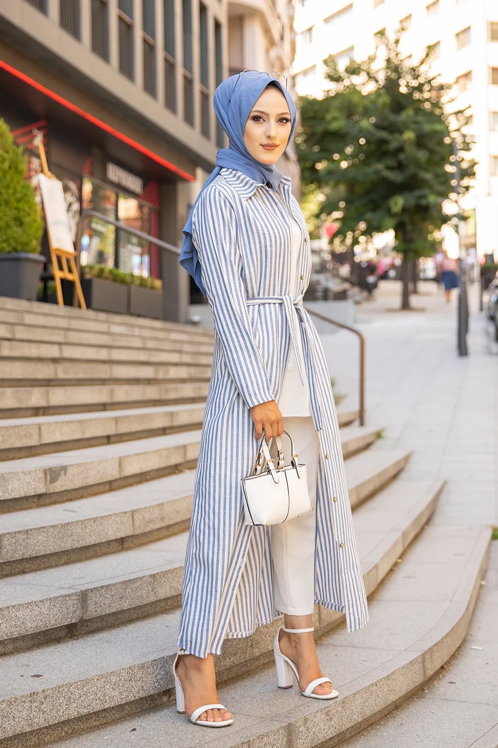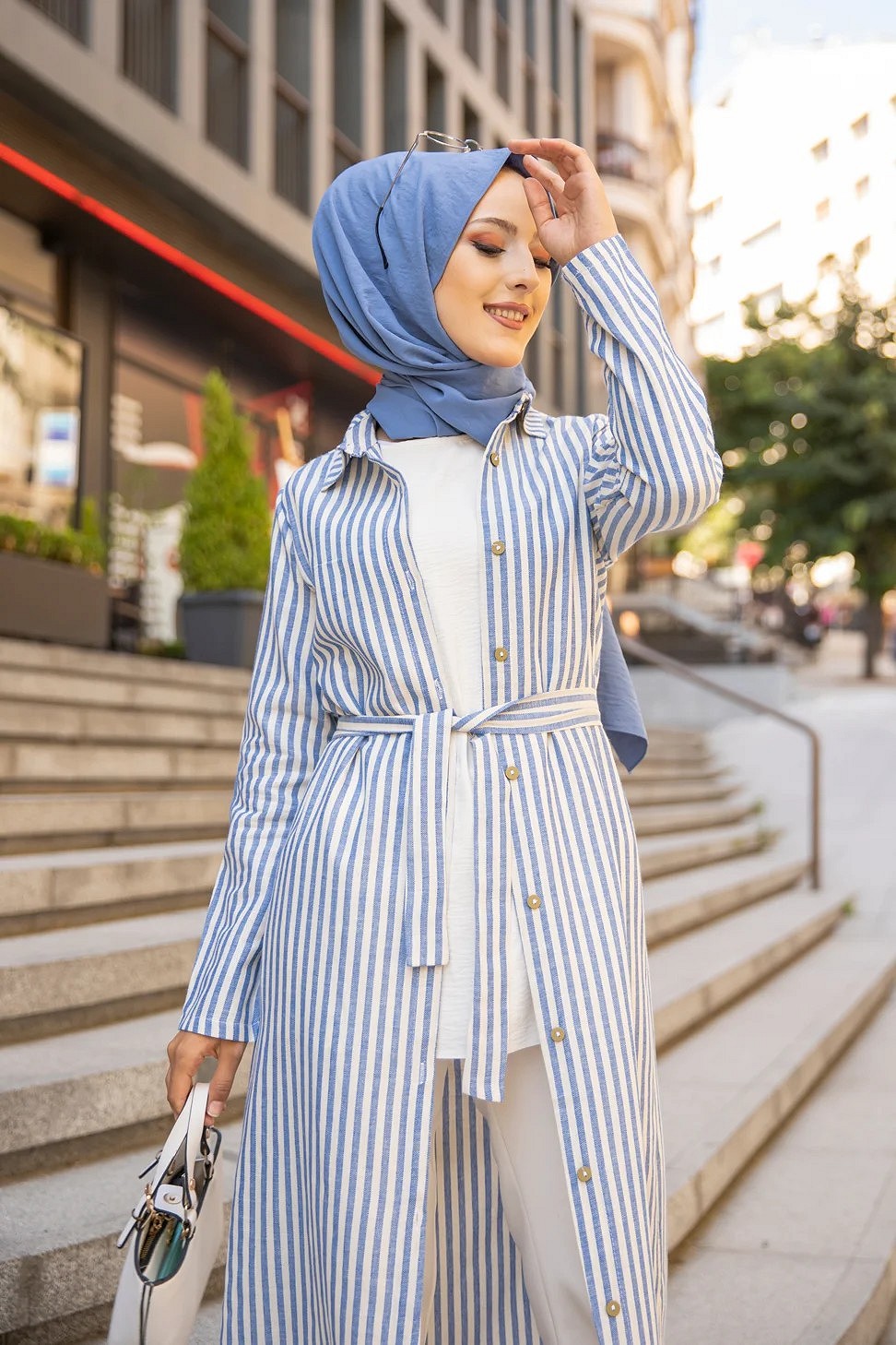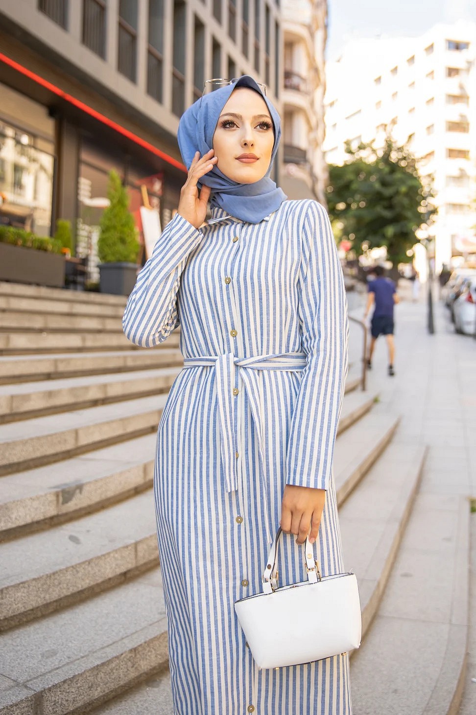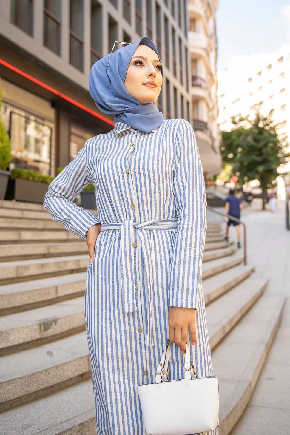 Robe chemise longue à rayures bleues avec ceinture (Vetement hijab femme musulmane) - REF. 32968 (29.90 €)