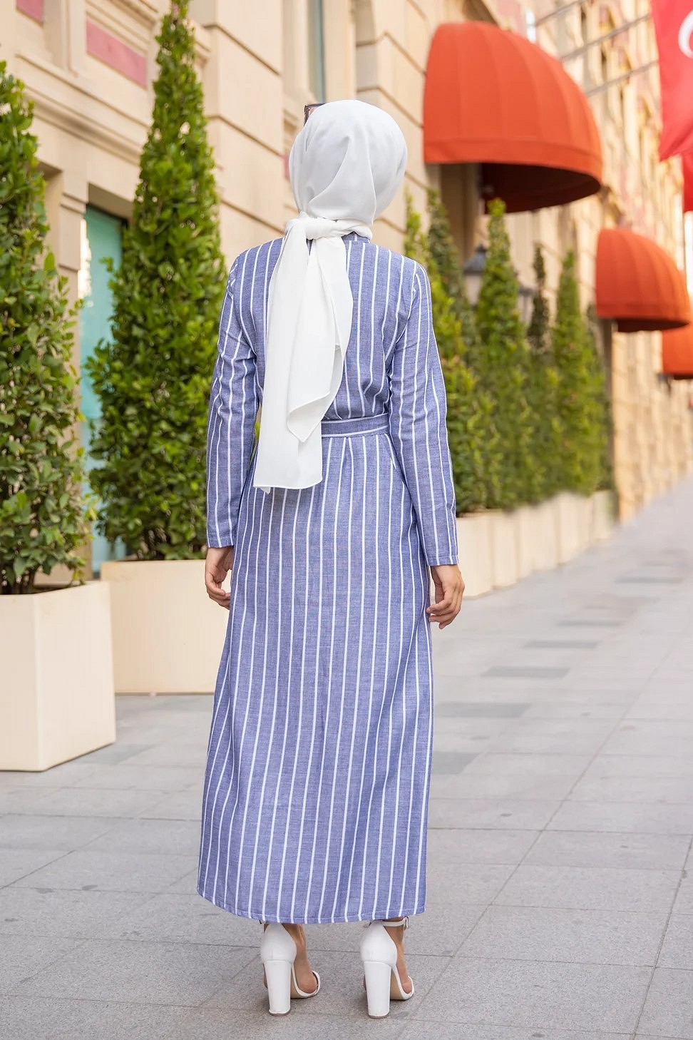 Robe a rayures entierement boutonnee devant avec ceinture assortie (Vetement d'ete femme voilee) - Couleur bleu et blanc