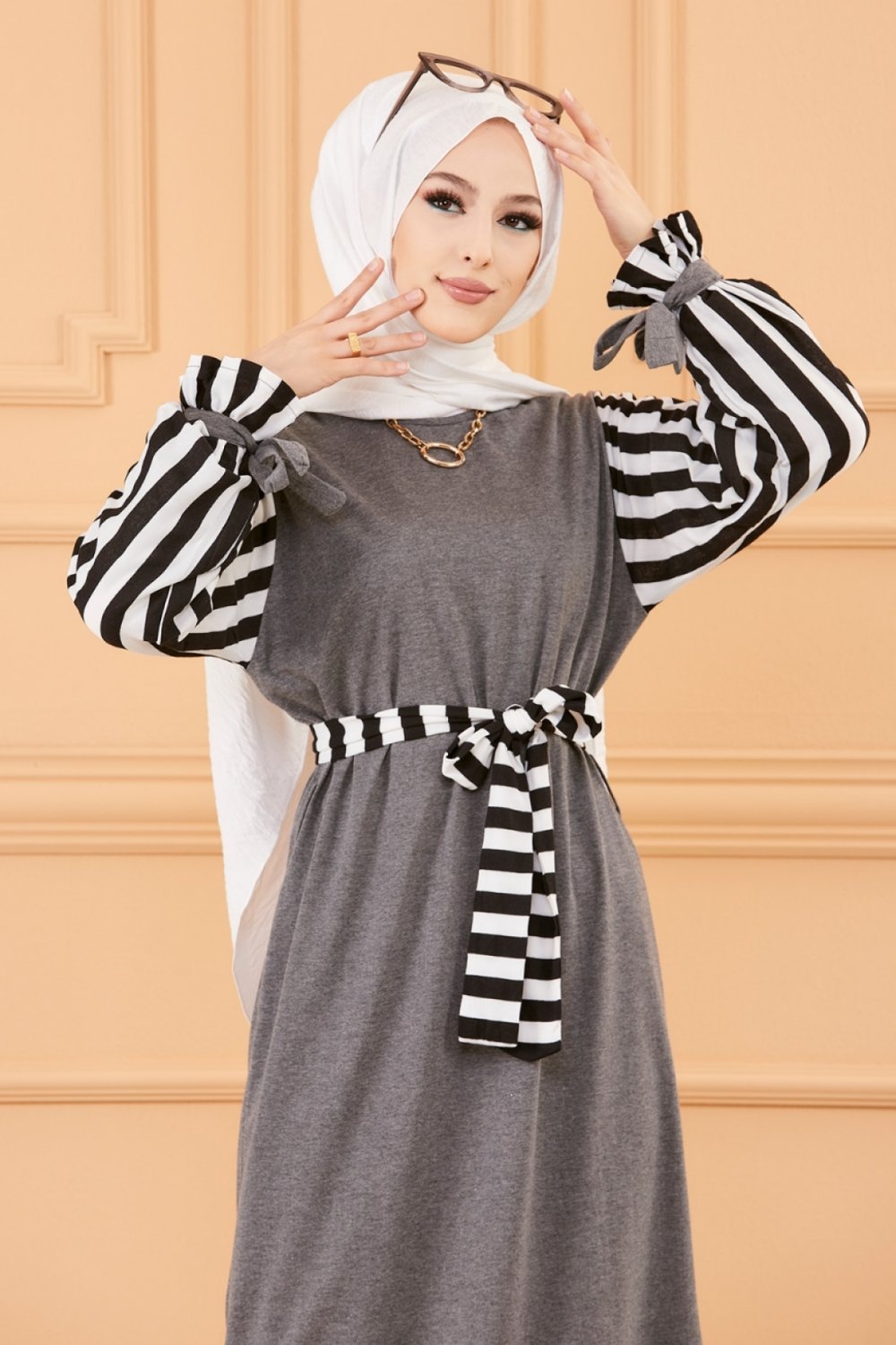Robe avec ceinture assortie - Couleur anthracite (avec motifs blancs et noirs) Vetement & Accessoire