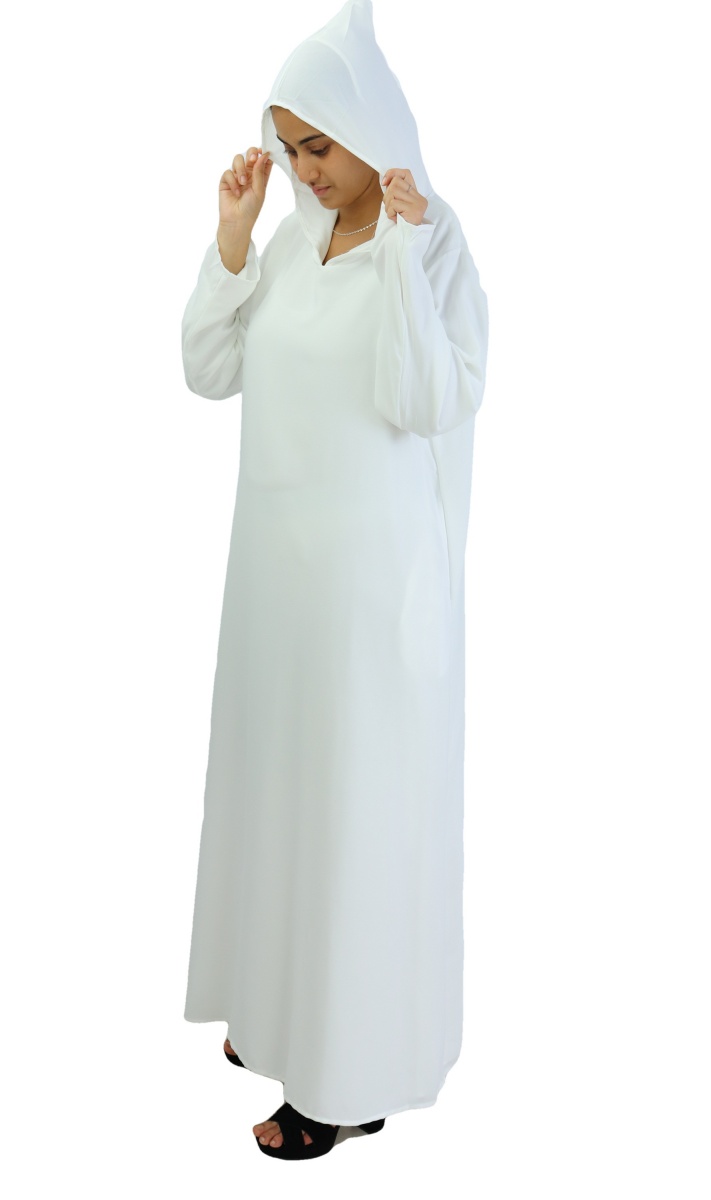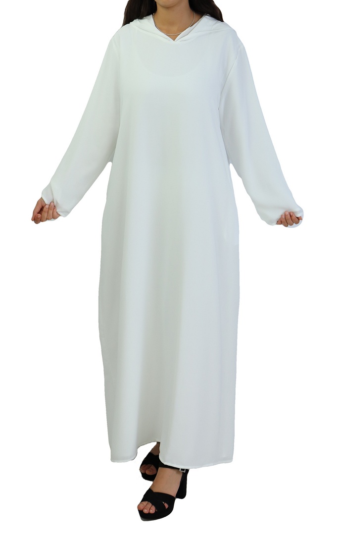 Robe longue et ample Couleur blanche unie, avec une capuche et 2 poches latérales. Tissu léger, peut être porté sur une autre robe.
