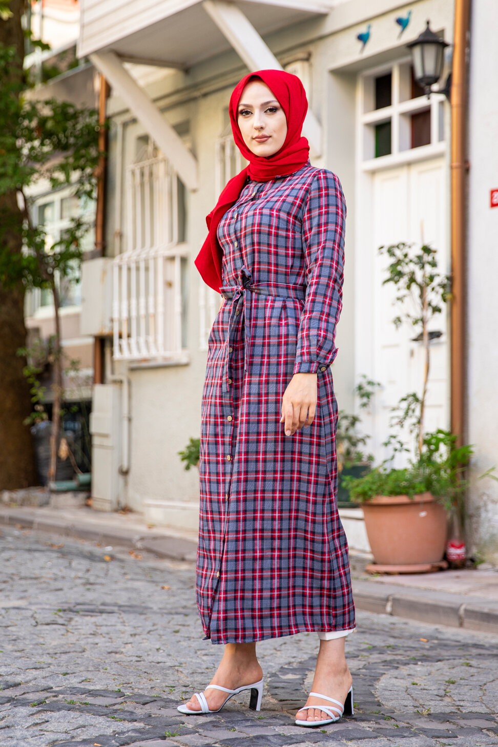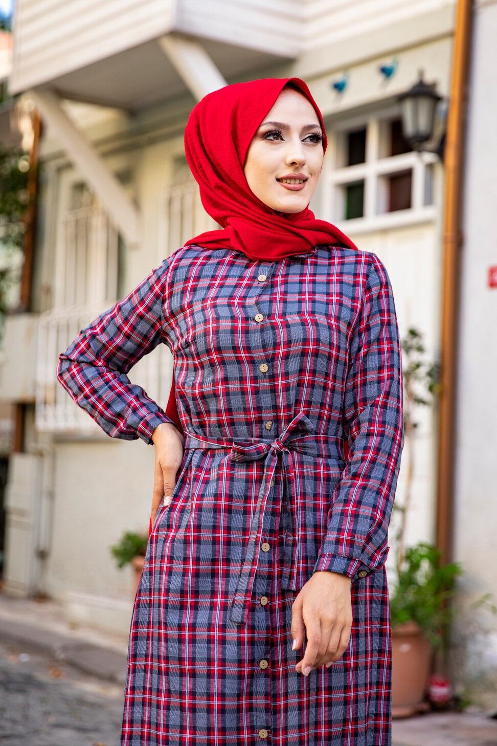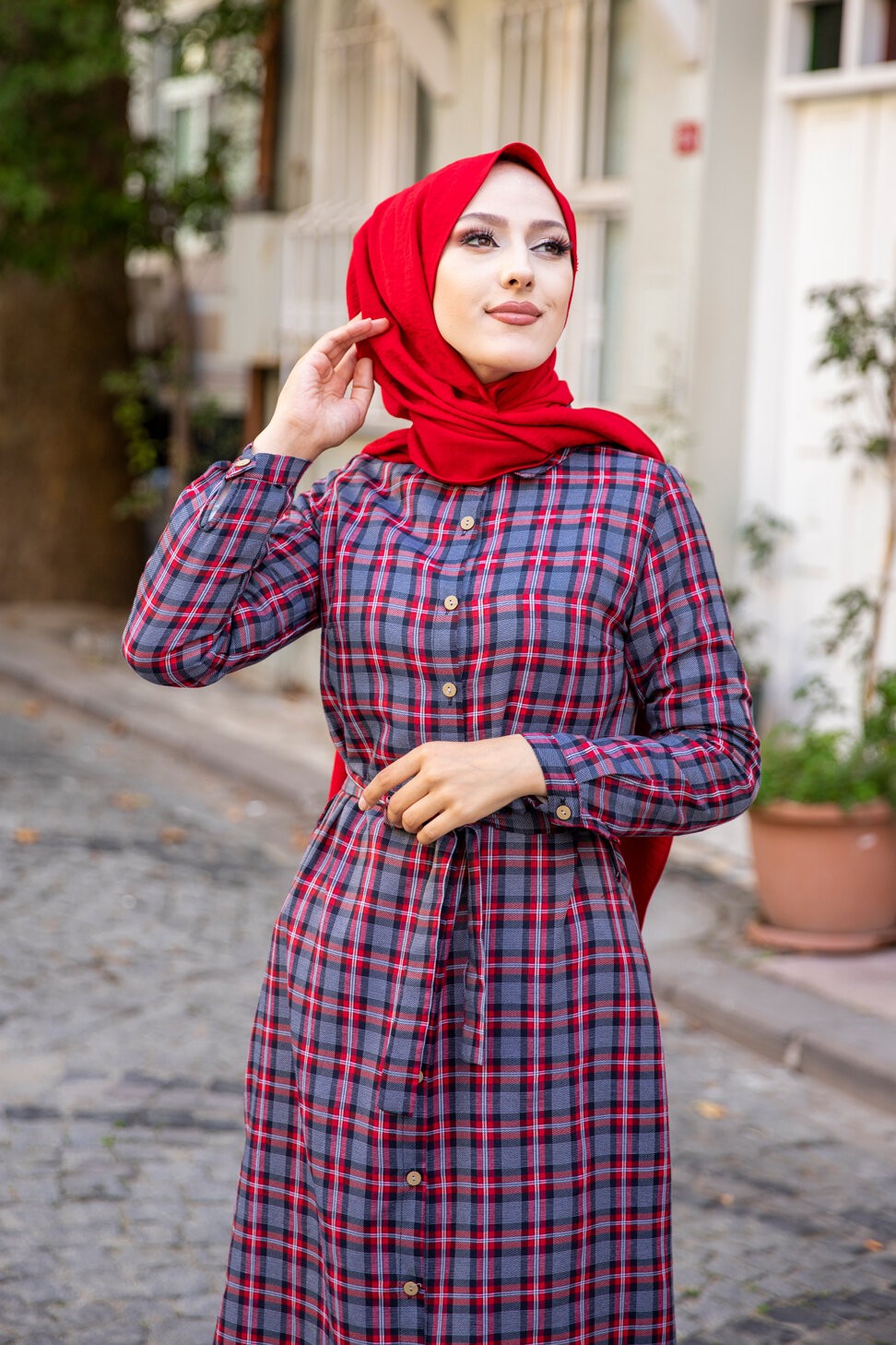 Robe boutonnée Chemise longue écossaise avec ceinture assortie (Vetement style hijab pour femme voilée) - Couleur rouge Vetement & Accessoire