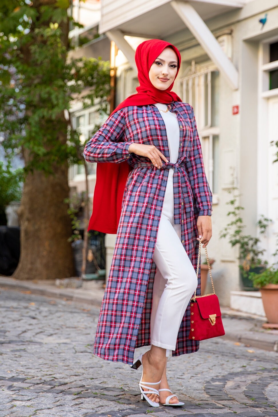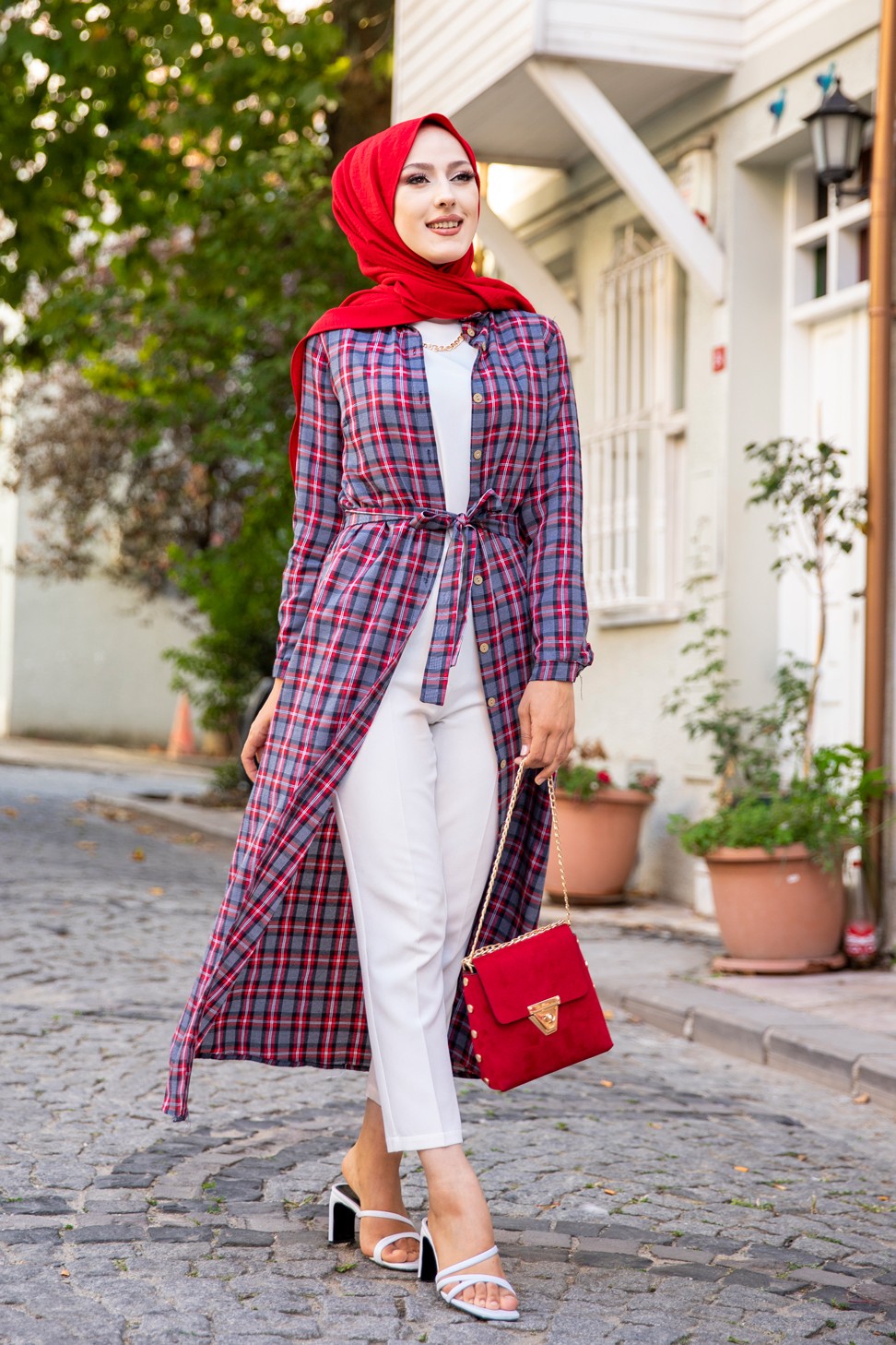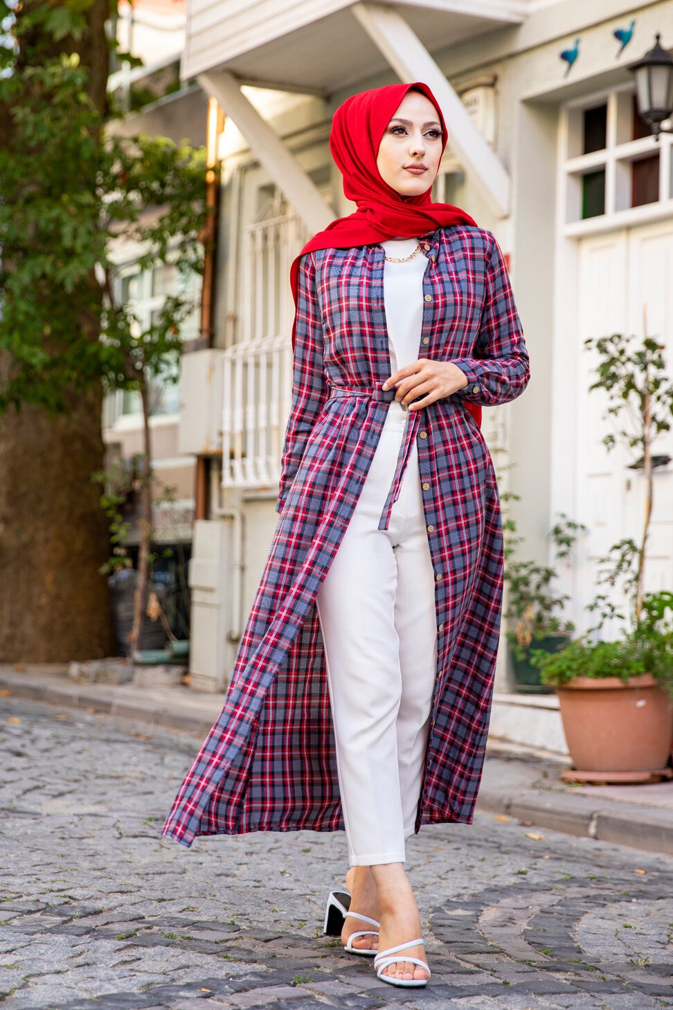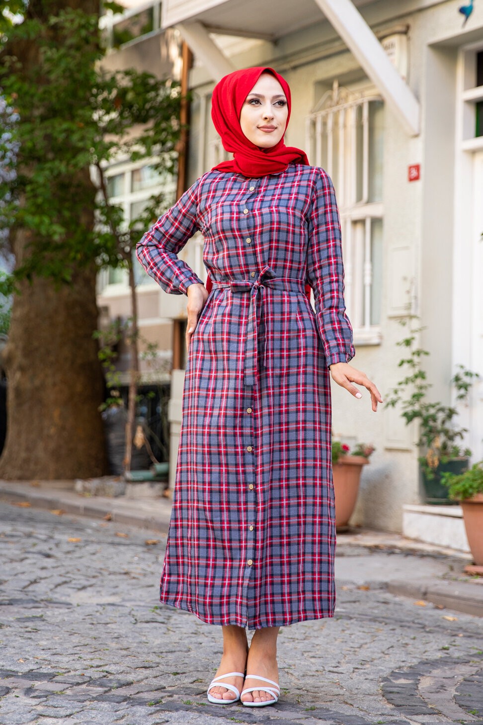 Robe boutonnée Chemise longue écossaise avec ceinture assortie (Vetement style hijab pour femme voilée) - Couleur rouge Vetement & Accessoire