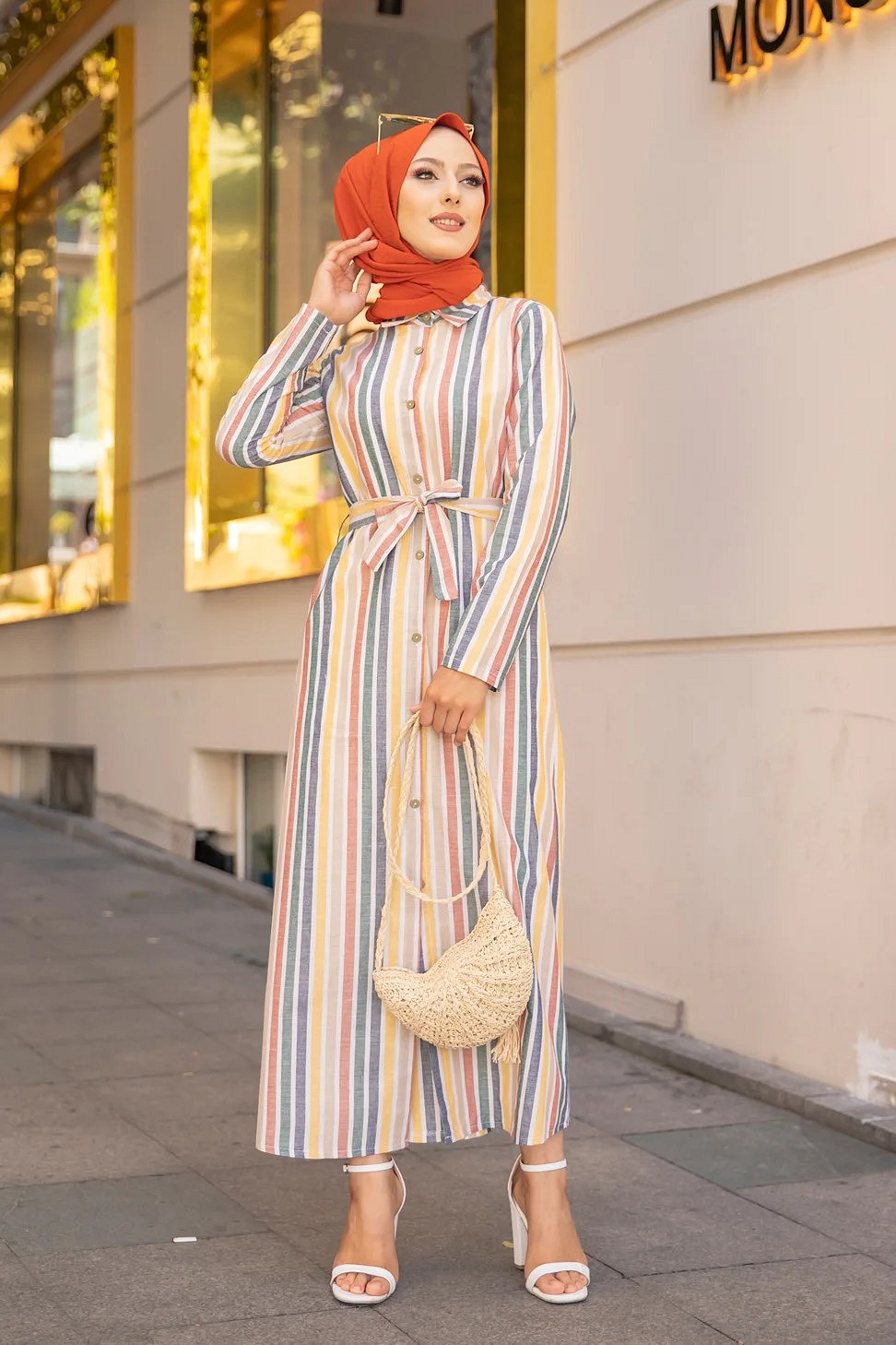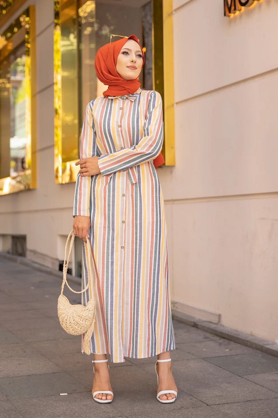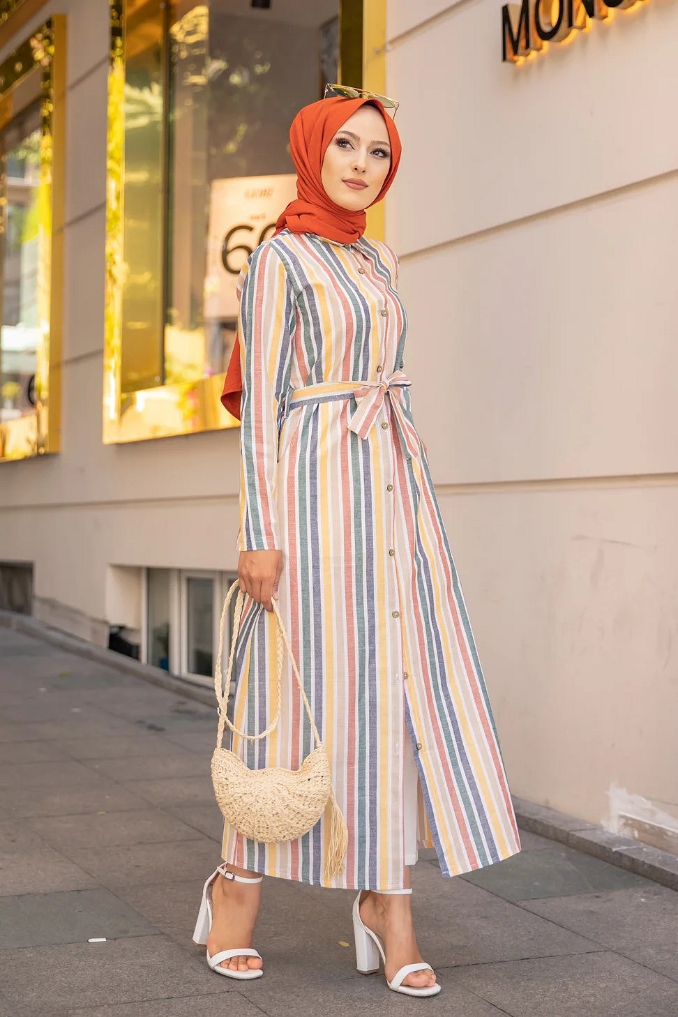 Robe chemise d'ete longue a rayures (Vetement hijab chic pour femme) - Multi couleurs