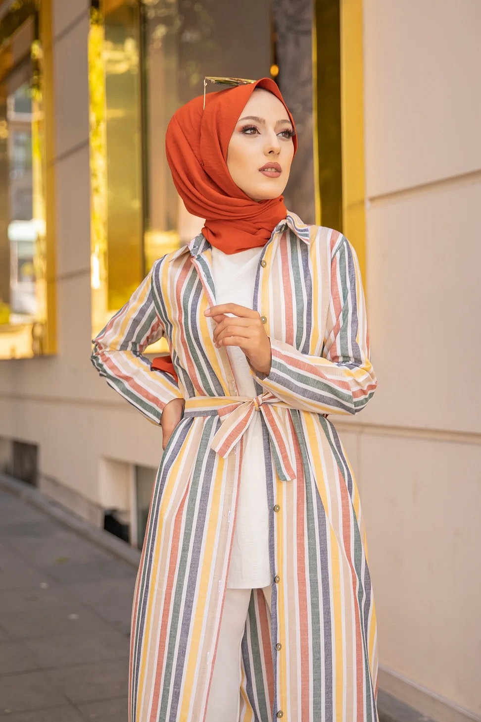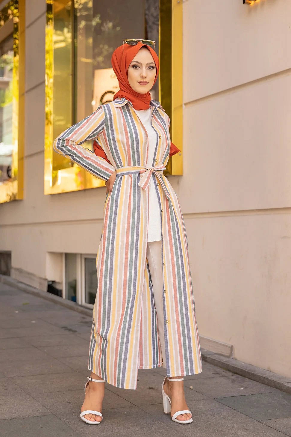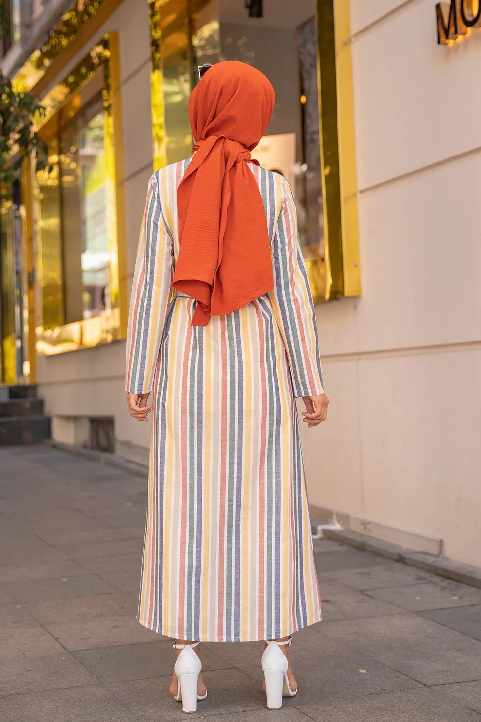 Robe chemise d'ete longue a rayures (Vetement hijab chic pour femme) - Multi couleurs