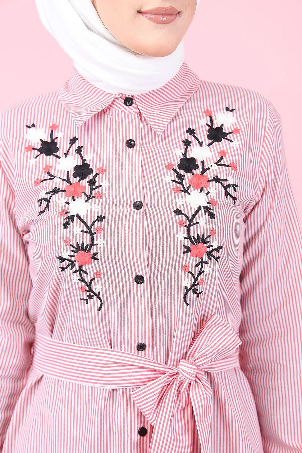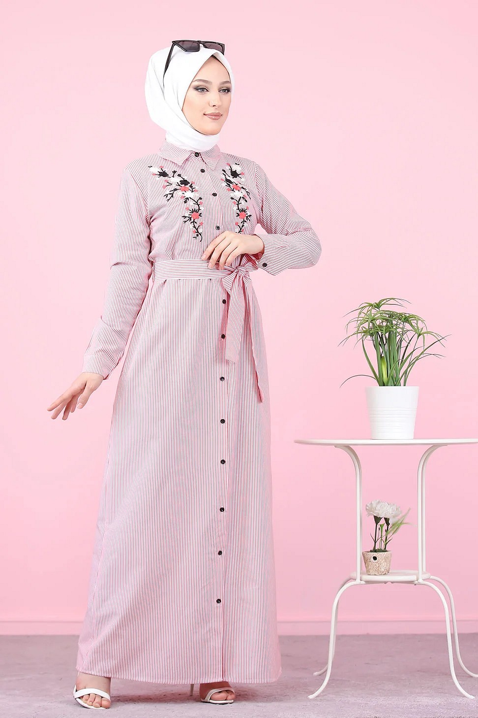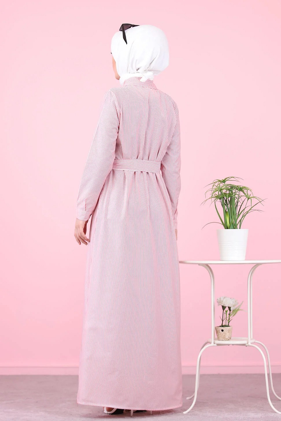 Robe chemise longue a rayures rouges avec ceinture (Vetement mastour femme musulmane)