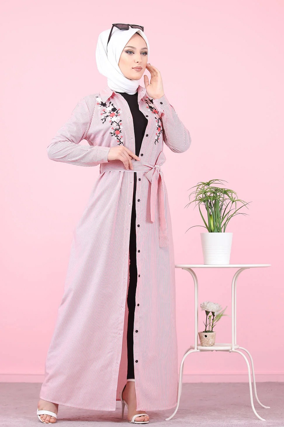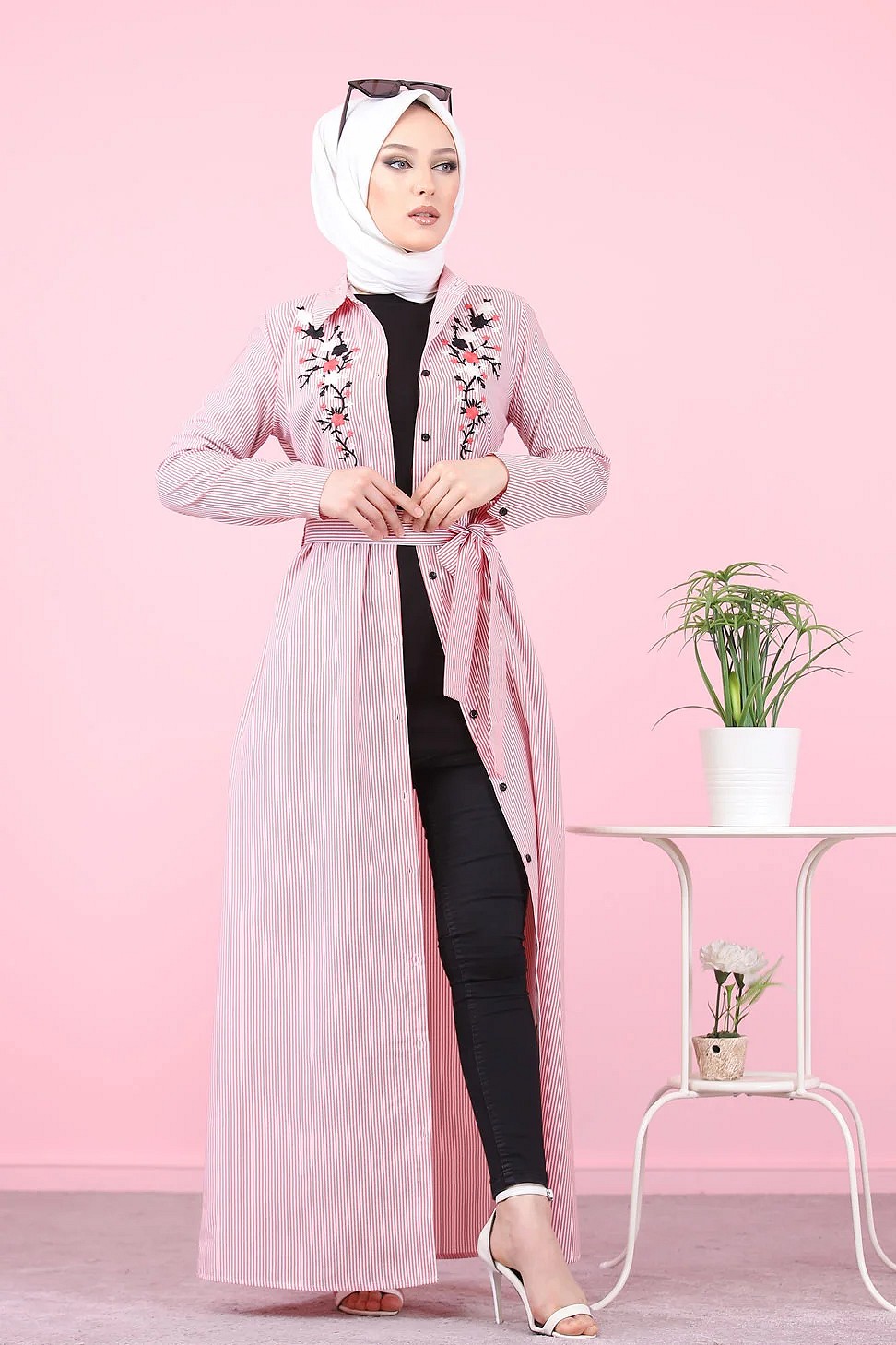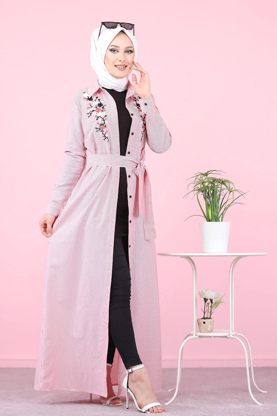 Robe chemise longue a rayures rouges avec ceinture (Vetement mastour femme musulmane)