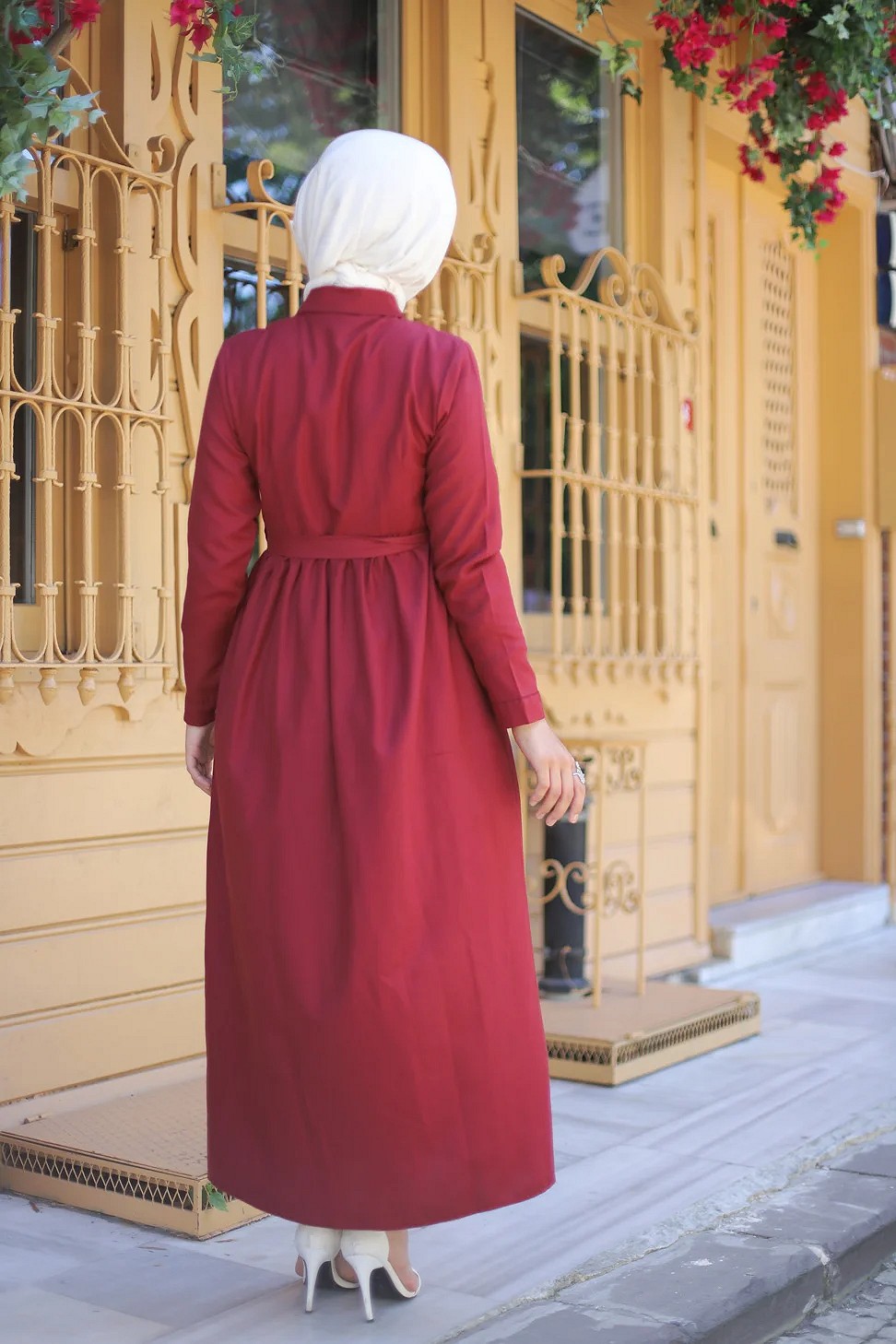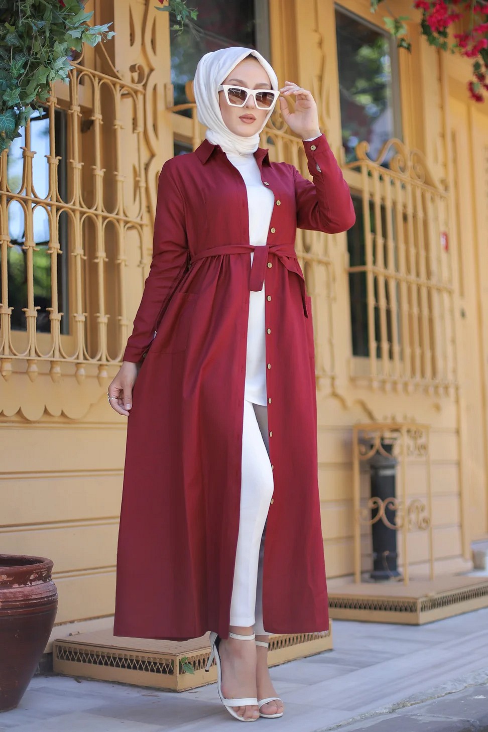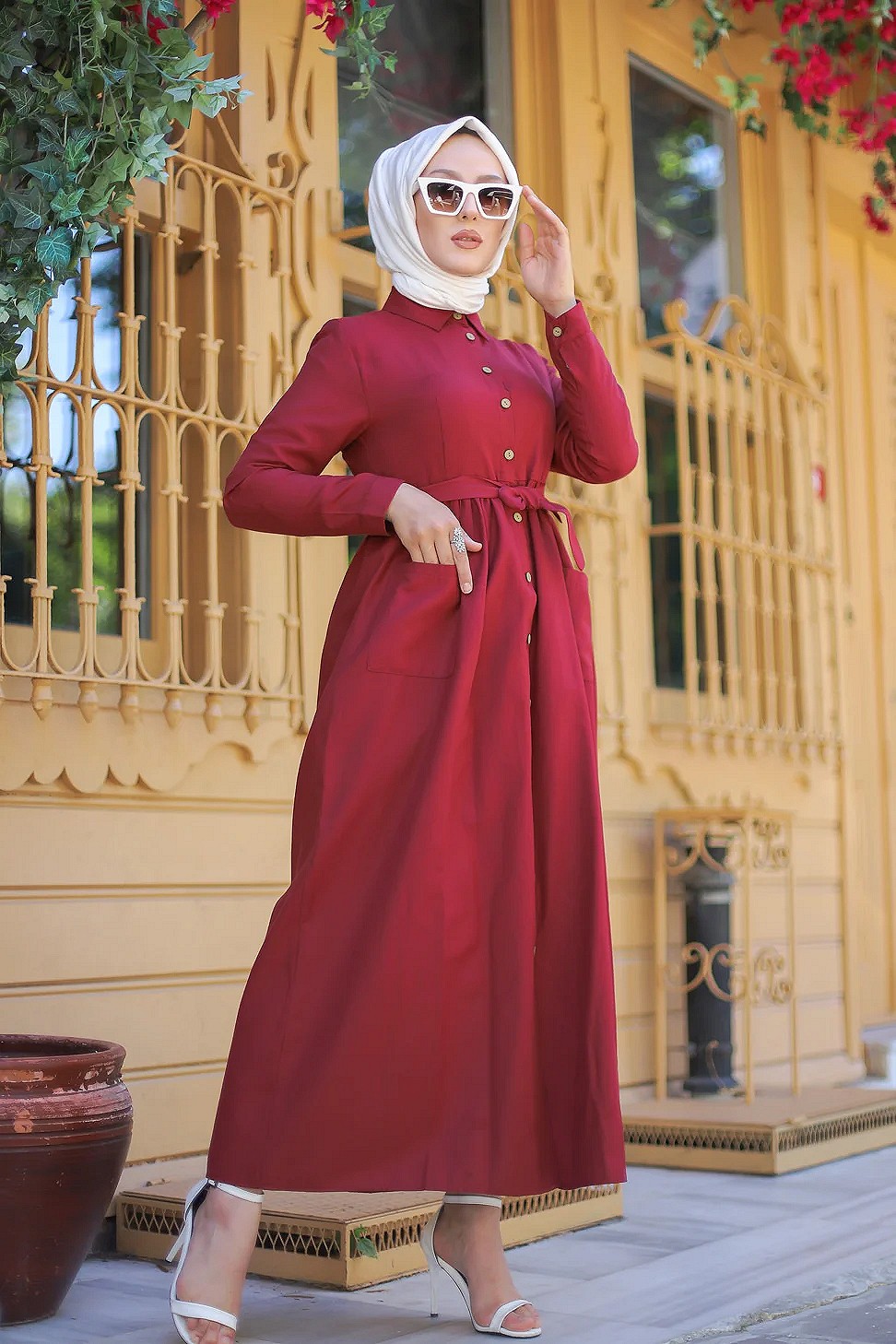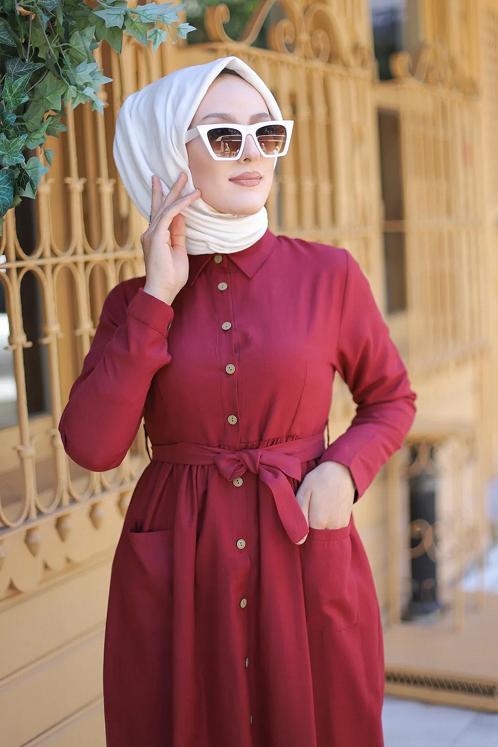 Robe chemise longue avec ceinture et grandes poches (Vetement pudique pour femme voilee) - Couleur bordeaux