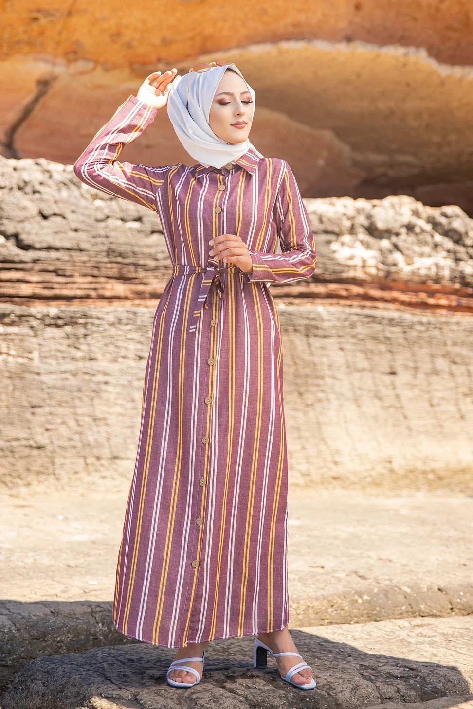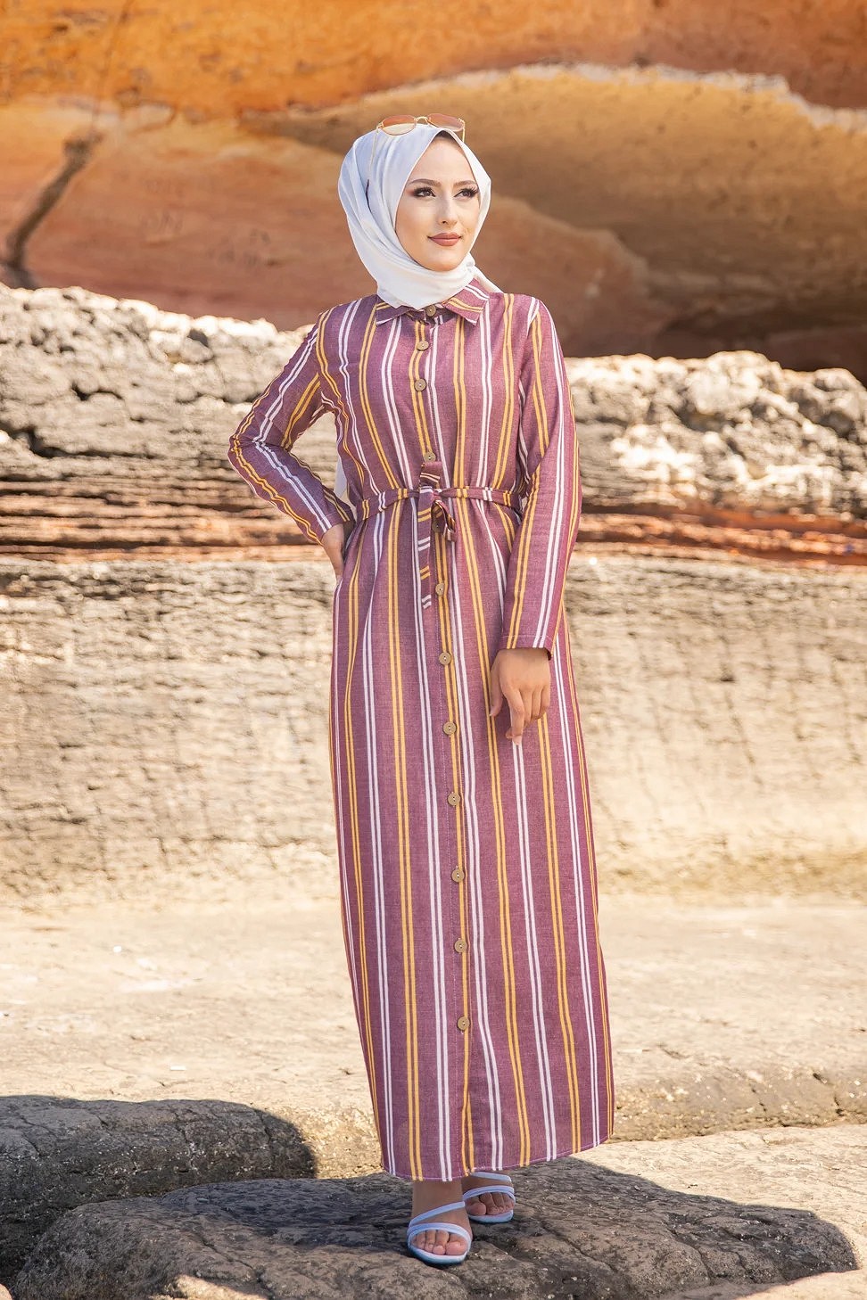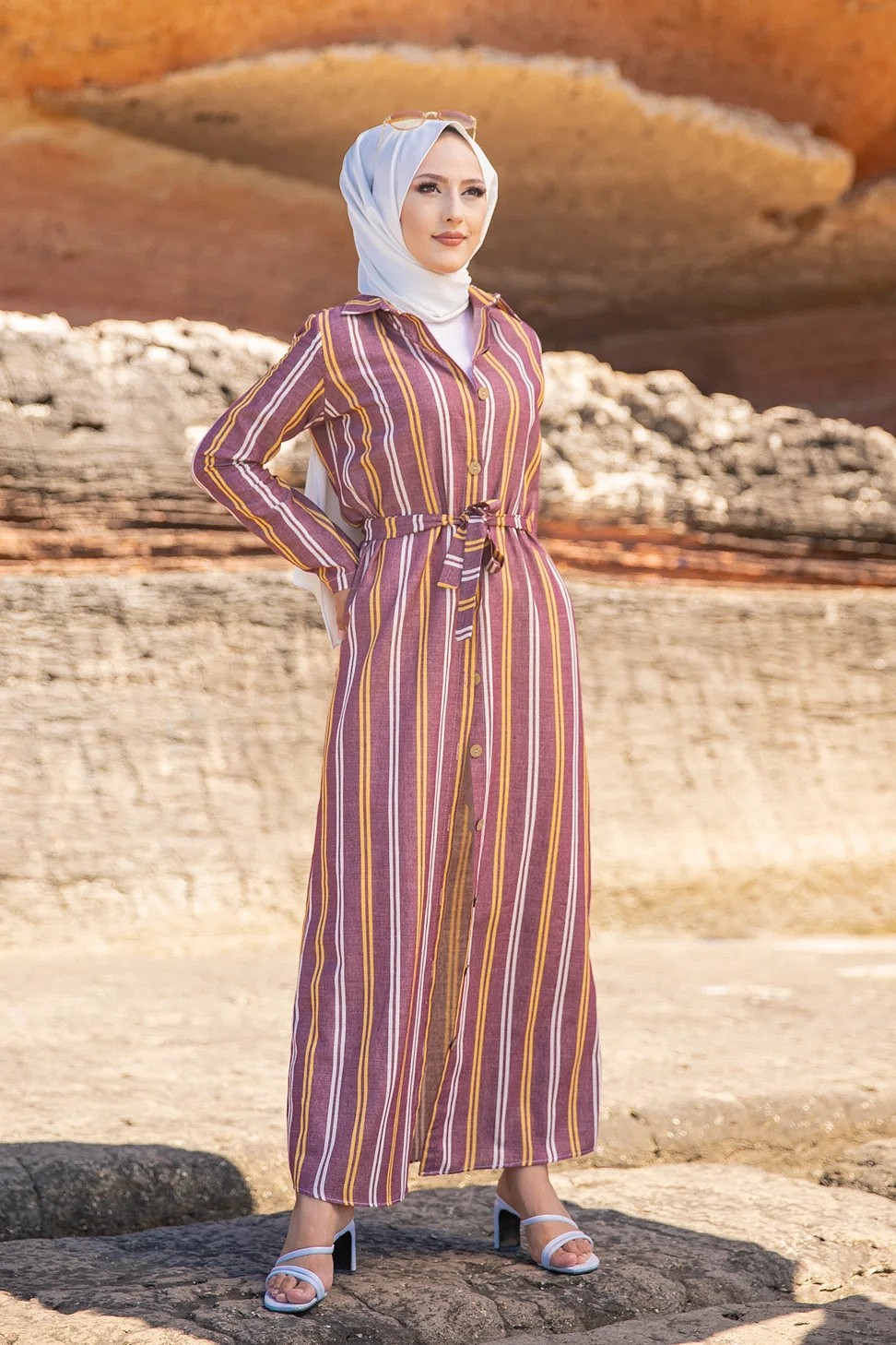 Robe chemise très longue à rayures (Vetement femme voilée chic) - Couleur bordeaux, rouille et blanc Vetement & Accessoire