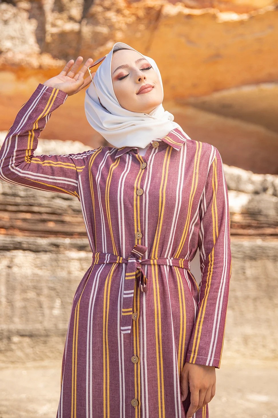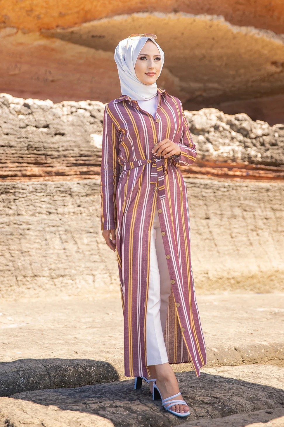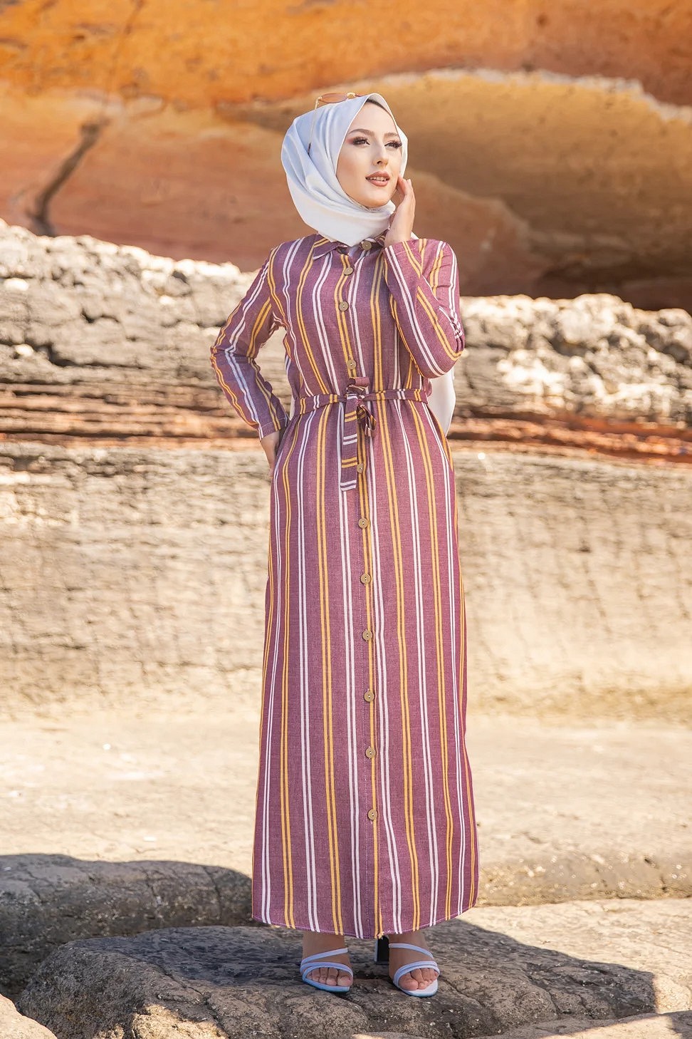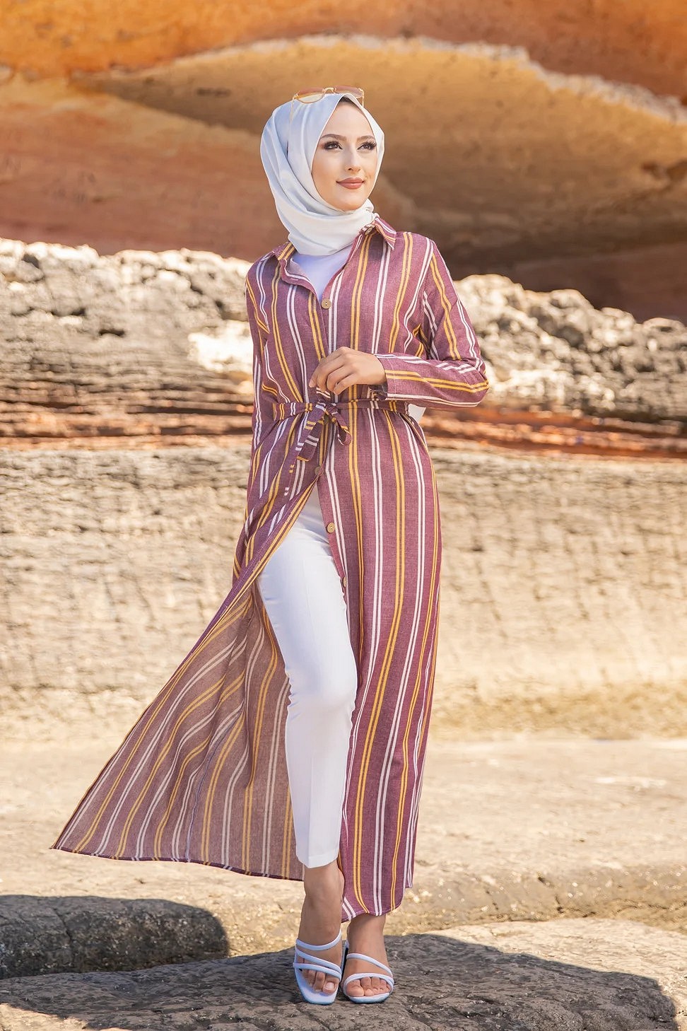Robe chemise très longue à rayures (Vetement femme voilée chic) - Couleur bordeaux, rouille et blanc Vetement & Accessoire